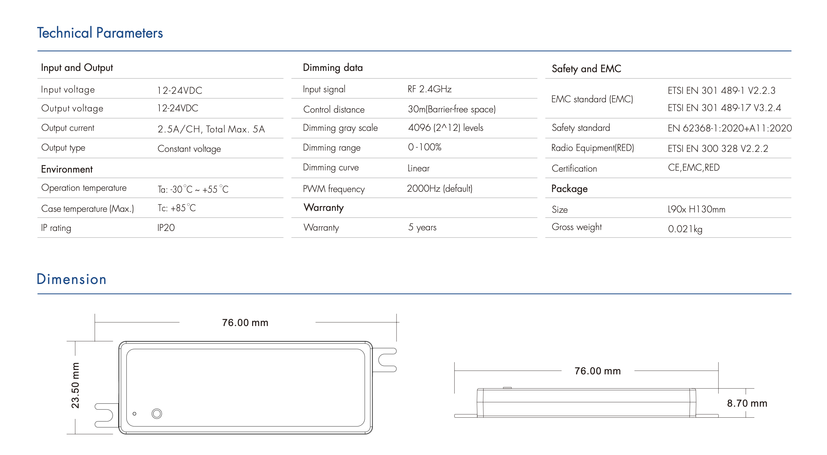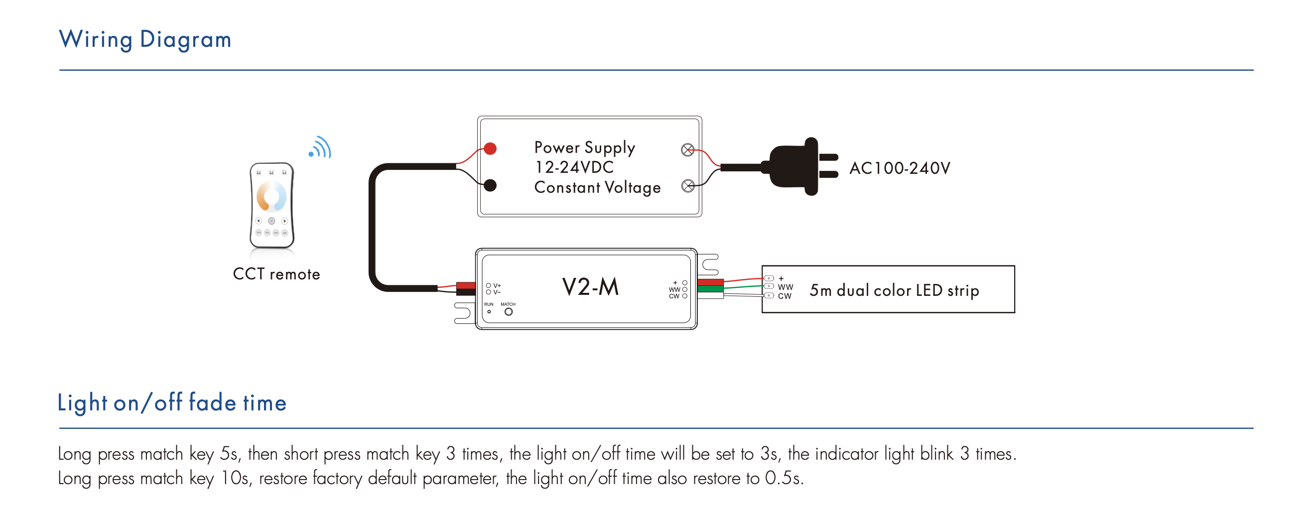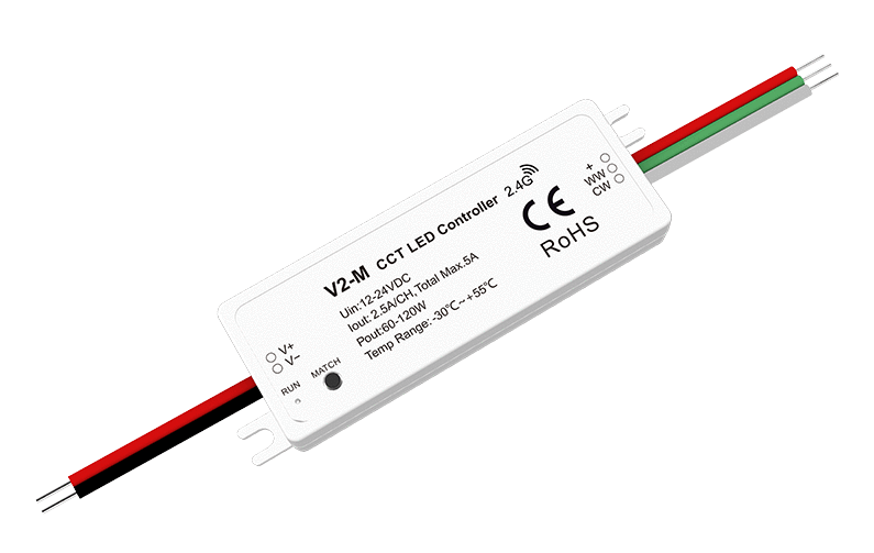 Dwukanałowy radiowy sterownik-ściemniacz LED V2-M służy do sterowania oświetleniem LED o zmiennej temperaturze barwowej