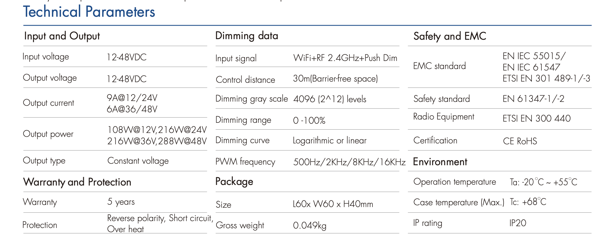 | Rodzaj sterowania | RF+WiFi+PushDimDC |