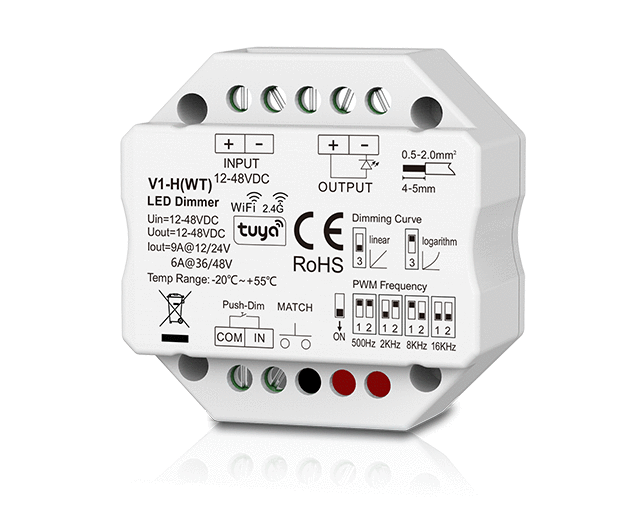Jedno-wyjściowy radiowy sterownik-ściemniacz LED V1-H(WT) służy do zarządzania natężeniem światła emitowanego przez jednokolorową taśmę LED przy pomocy radio RF, WiFi oraz Push-switch (przycisk mono stabilny).