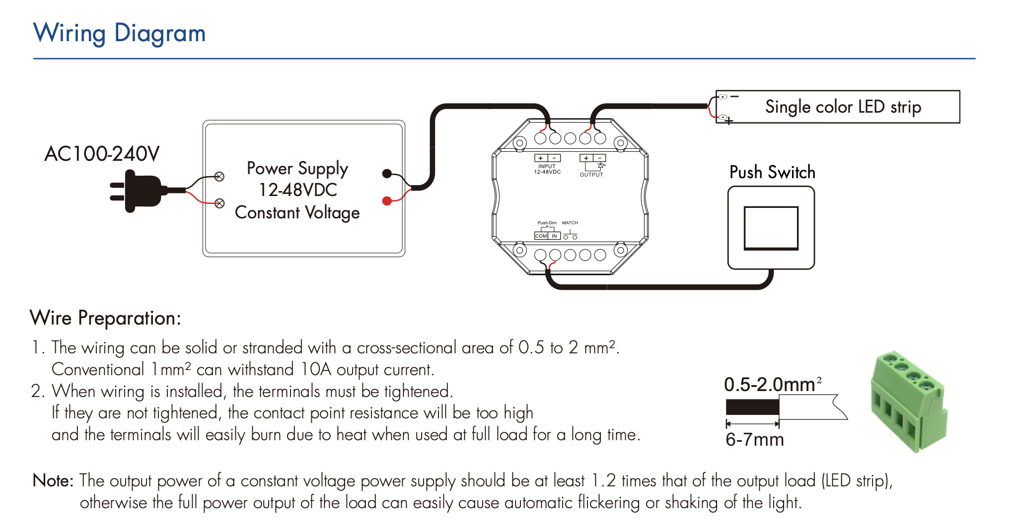 - Możliwość podłączenia zewnętrznego przycisku mono-stabilnego do realizacji funkcji włącz/wyłącz oraz płynnego ściemniania w zakresie 0–100%