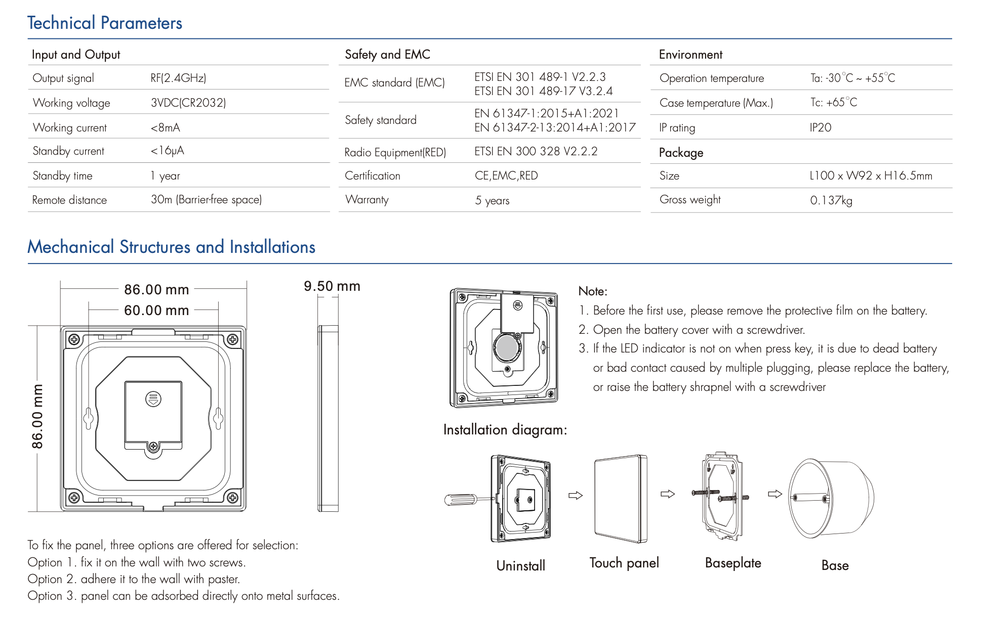 - Panel dotykowy 4-strefowy, 2 kolorowy CCT, RF nadajnik