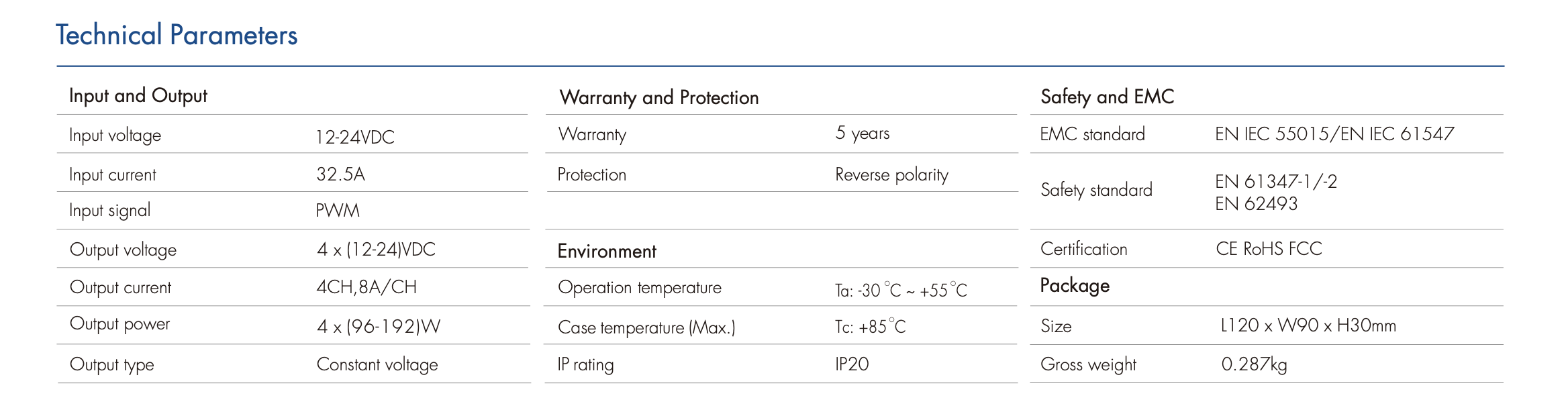 • Liczba kanałów wyjściowych: 4 x 8 A