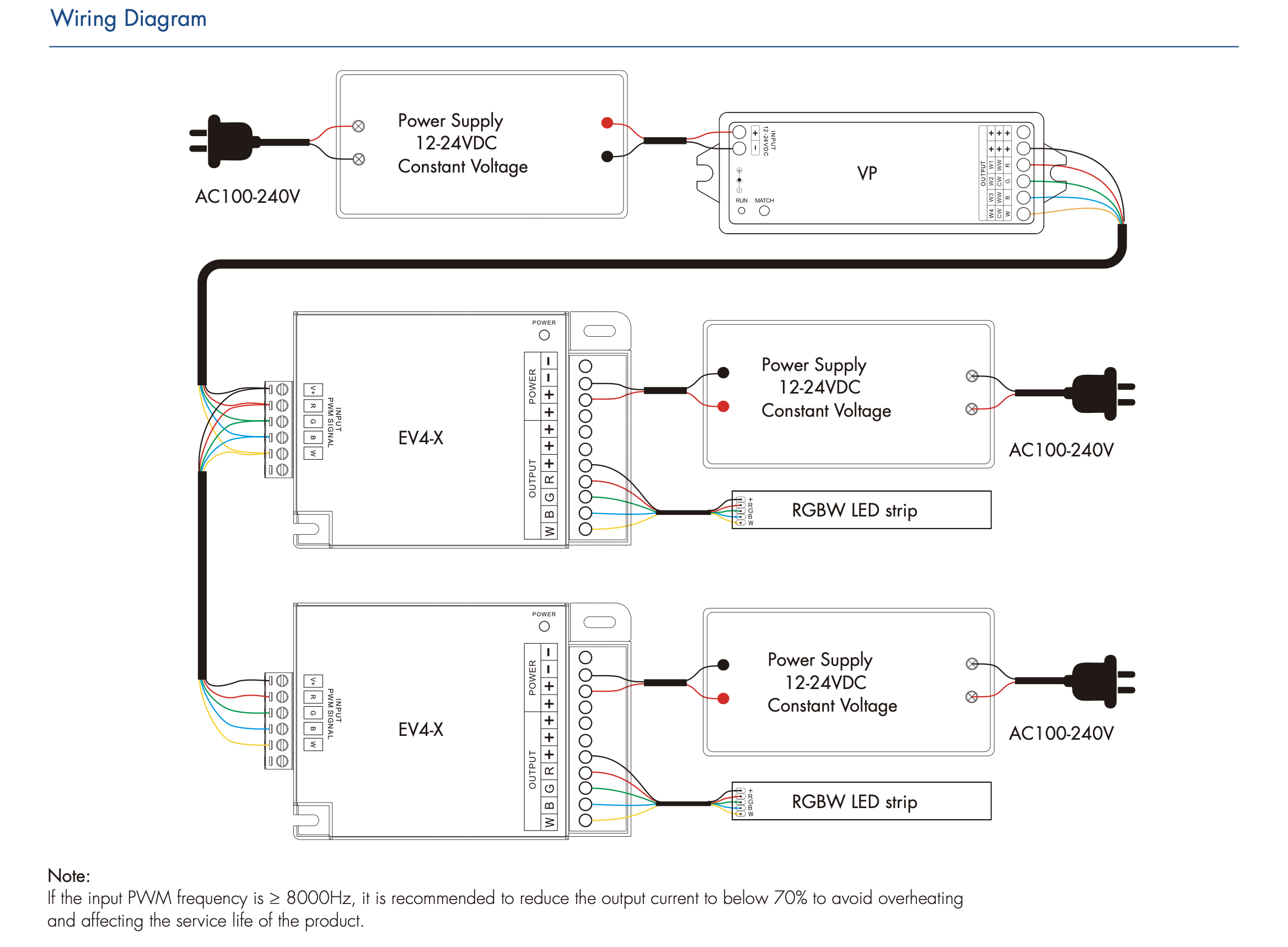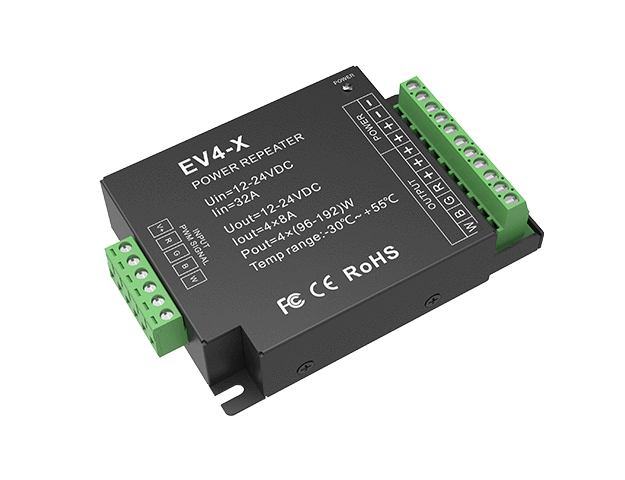 4-wyjściowy wzmacniacz LED EV4-X służy do zwiększenia mocy sterownika mono/CCT/RGB/RGBW i umożliwia podłączenie większej ilości taśmy do 1 sterownika.