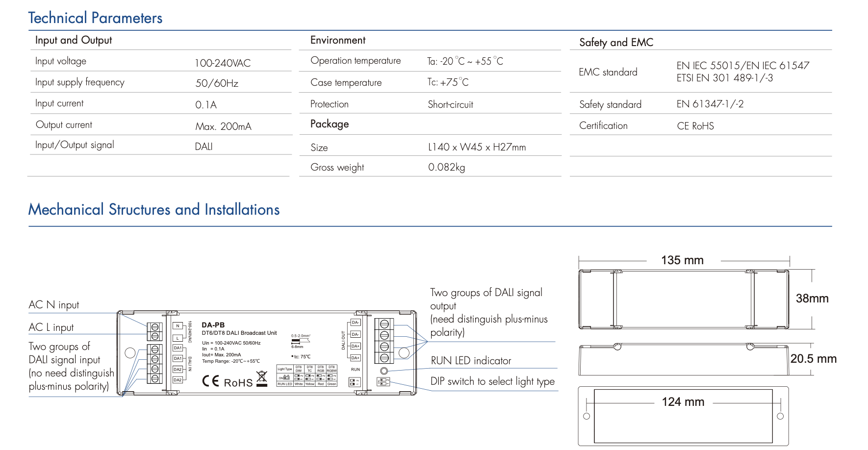 - Zgodny z protokołem standardu DALI IEC 62386-102, IEC 62386-207, IEC 62386-209 oraz kompatybilny z produktami DALI innych producentów międzynarodowych