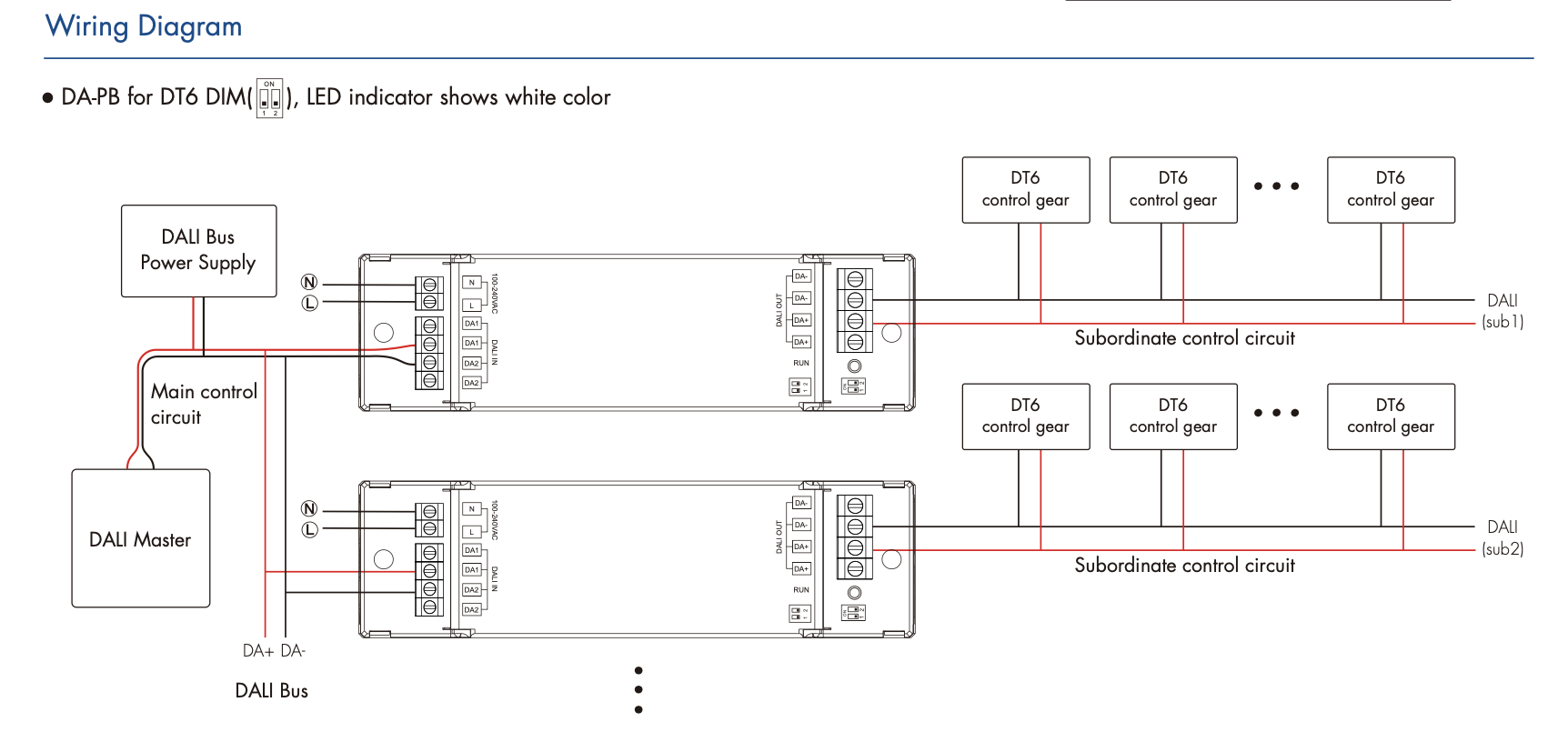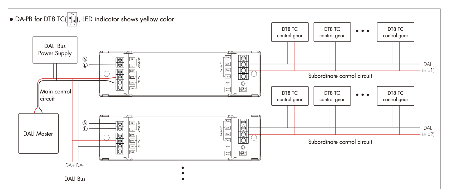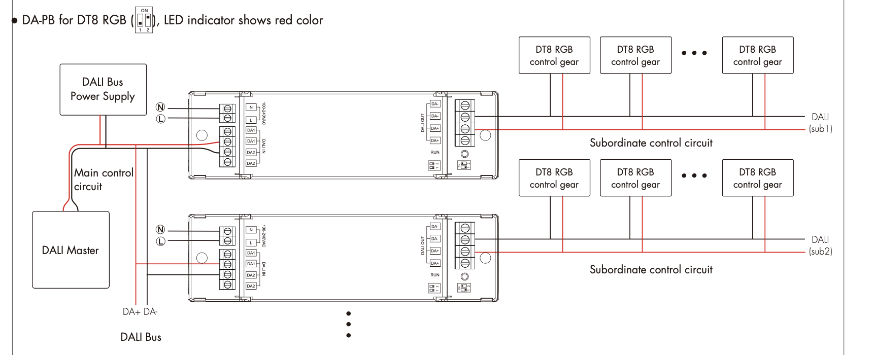 - Każda jednostka nadawcza zajmuje jeden adres DALI, a do jednej magistrali można podłączyć maksymalnie 64 jednostki nadawcze