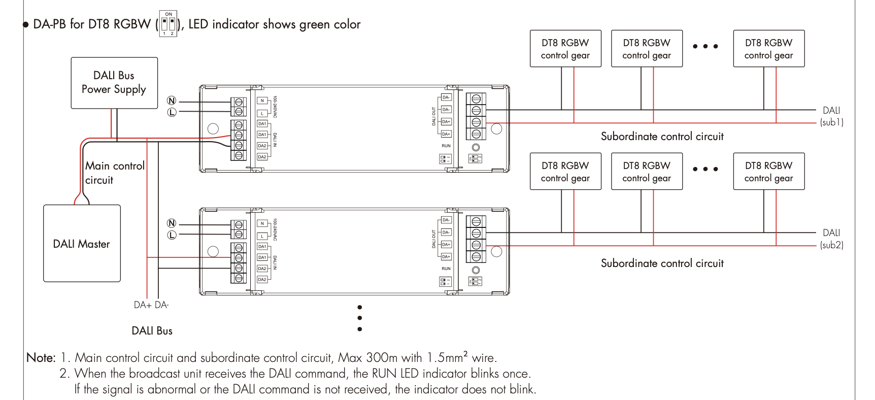- Odbiera polecenia DT6/DT8 z głównego obwodu DALI jako urządzenie sterujące z pojedynczym adresem i przekazuje odebrane polecenia DALI do wszystkich urządzeń sterujących podłączonych do wyjścia DALI OUT w formie poleceń nadawczych (broadcast)