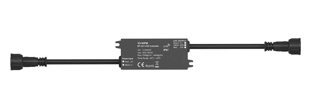 Jednokanałowy wodoszczelny radiowy sterownik-ściemniacz LED V2-WPM służy do sterowania światłem emitowanym taśmami LED CCT Multiwhite.