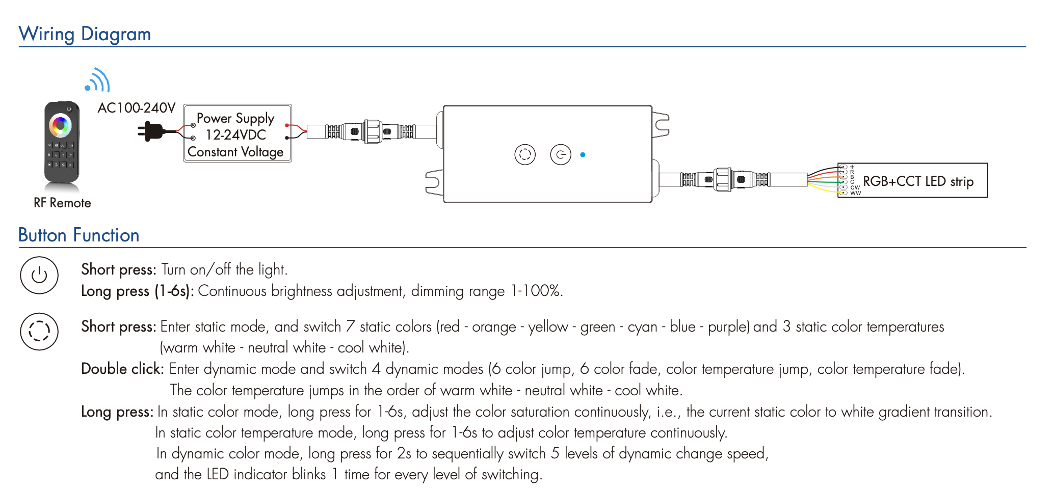 • Opcjonalnie kompatybilny z pilotem RF 2.4G do sterowania w jednej lub wielu strefach RGB+CCT