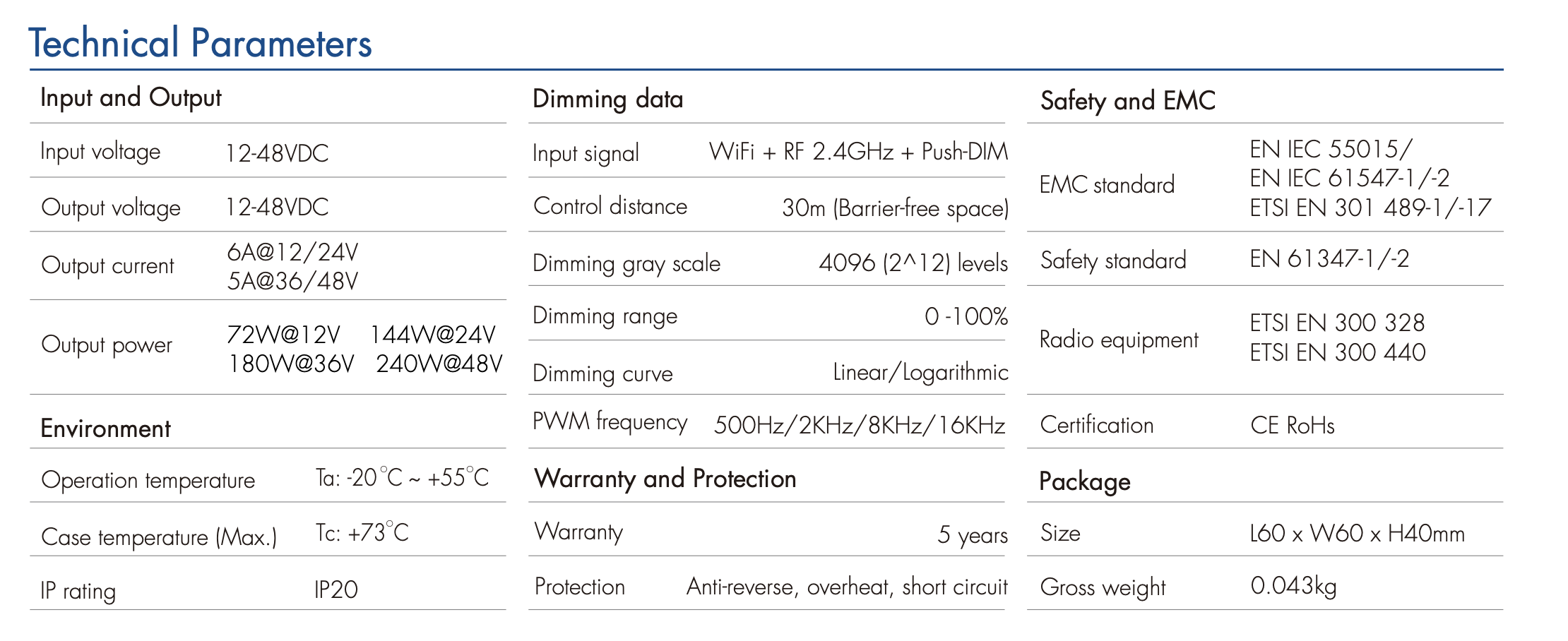 | Rodzaj sterowania | RF+WiFi+PushDimDC |