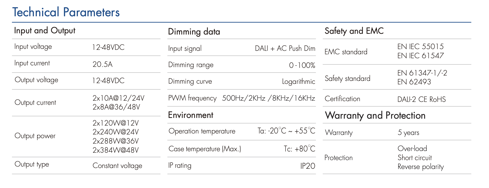 - Certyfikowany DALI-2, zgodny z protokołem DALI wg norm IEC 62386-102, 207, 209 oraz kompatybilny z urządzeniami DALI innych producentów