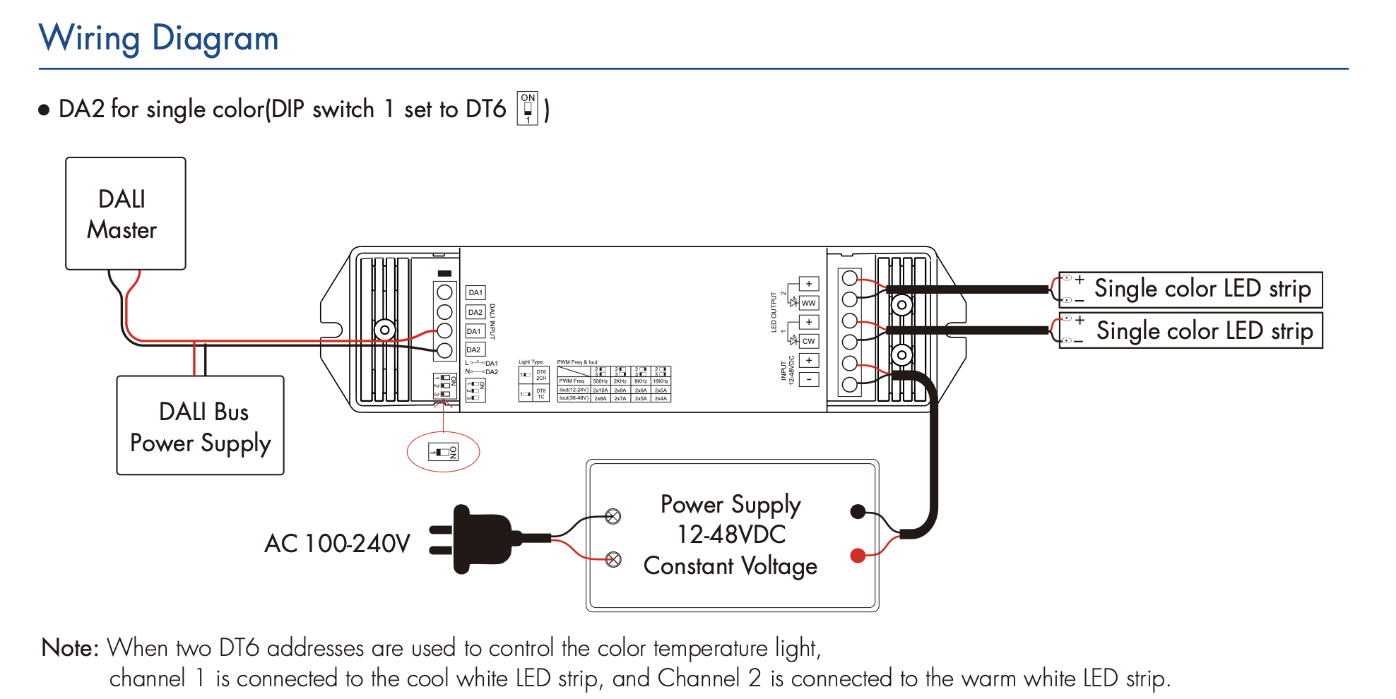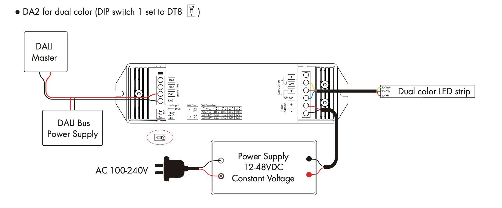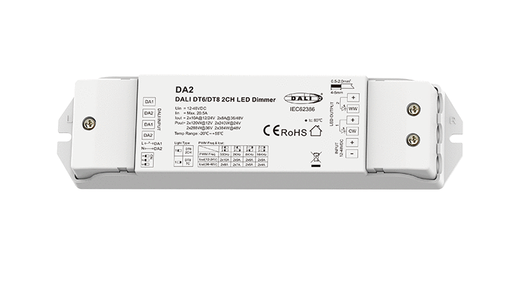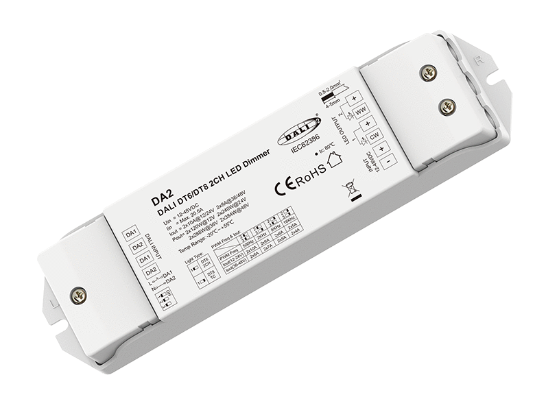 Sterownik DA2 to 2-kanałowy sterownik który zapełnia możliwość sterowania monochromatycznymi & multiwhite (CCT) taśmami LED za pomocą protokołu DALI.