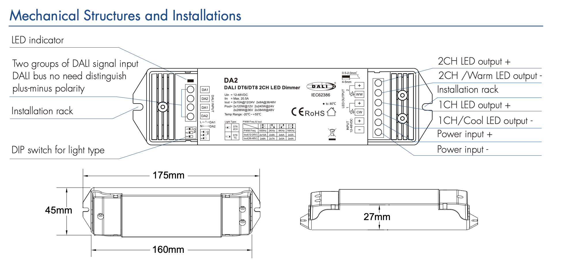 - 2-kanałowy ściemniacz LED DALI o stałym napięciu, maksymalny prąd wyjściowy 10A na kanał