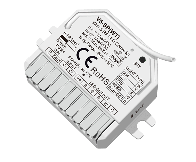 V5-SP(WT) to 5-wyjściowy sterownik, odbiornik RF firmy Skydance przeznaczony do sterowania taśmami LED: