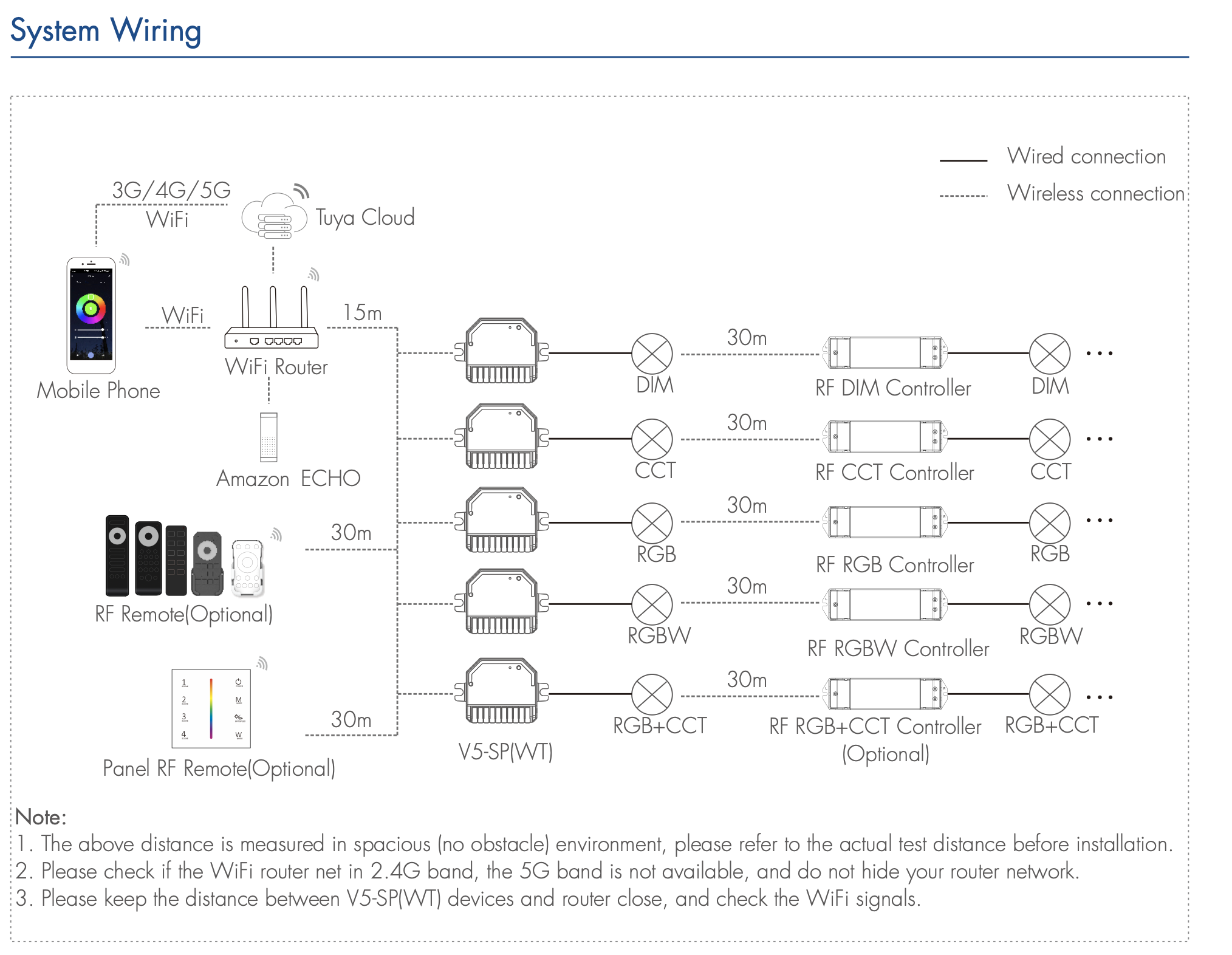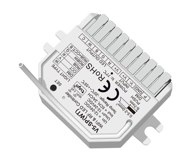 - Każdy sterownik V5-SP(WT) może również działać jako konwerter WiFi-RF, umożliwiając sterowanie przez aplikację Tuya Smart jednym lub wieloma sterownikami LED RF albo zasilaczami LED RF ze ściemnianiem w trybie synchronicznym