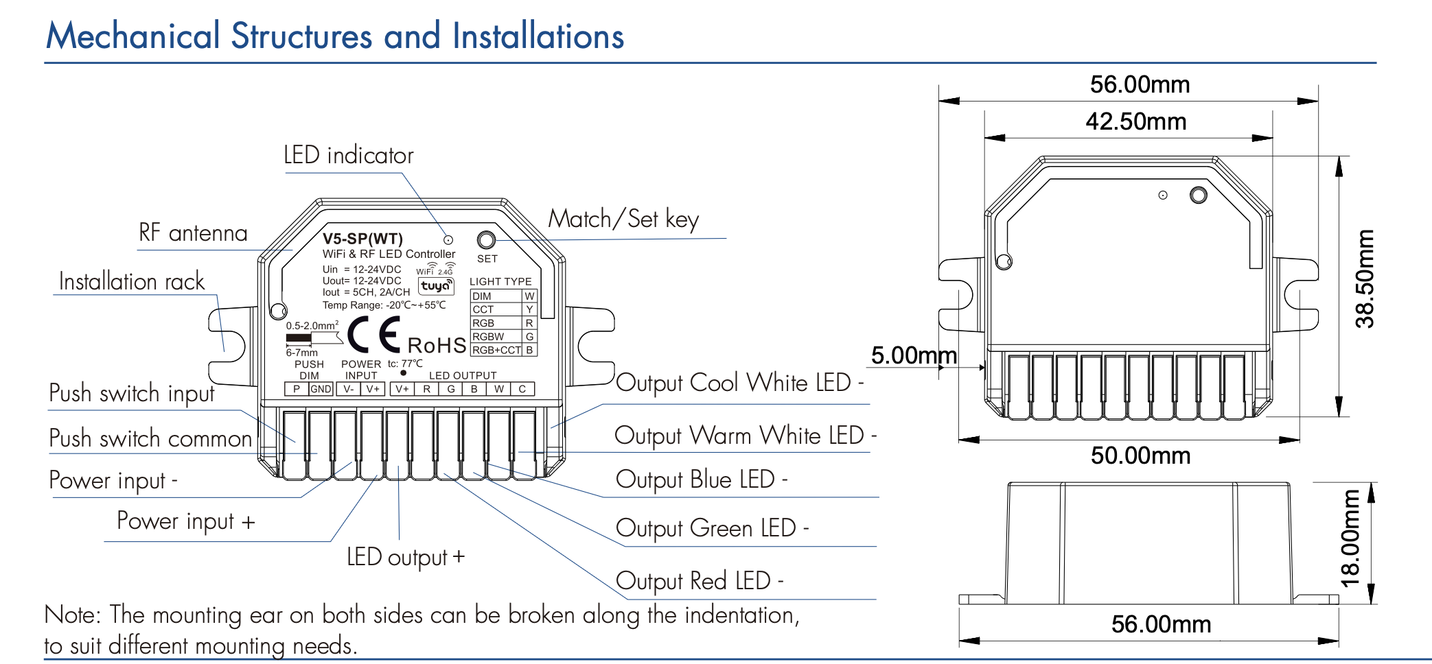 - Funkcja 5-w-1, dla taśm LED jednokolorowych, CCT (regulacja temperatury barwowej), RGB, RGBW oraz RGB+CCT