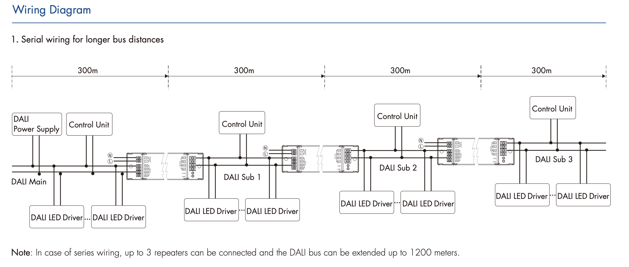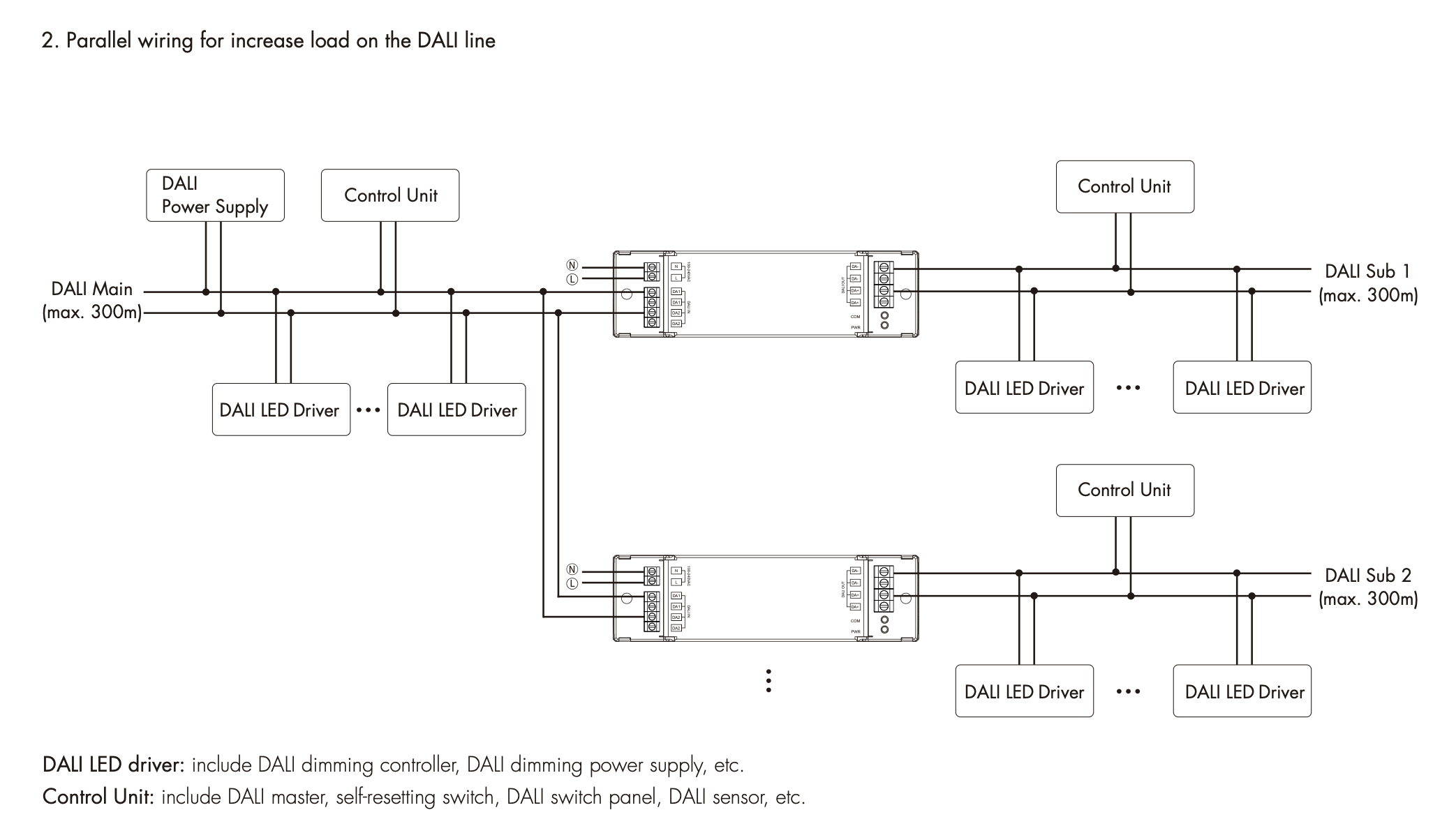 • Maksymalna liczba urządzeń DALI w całej sieci (główny i podrzędny obwód) jest ograniczona do 64, urządzenia można dowolnie podzielić na obwód podrzędny