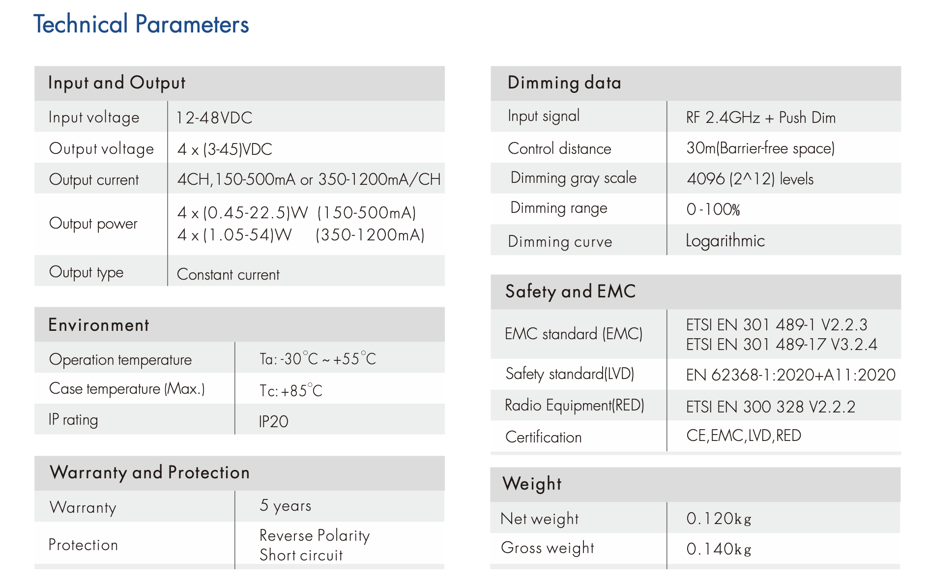 - Liczba kanałów wyjściowych: 4CH x 350-1200mA