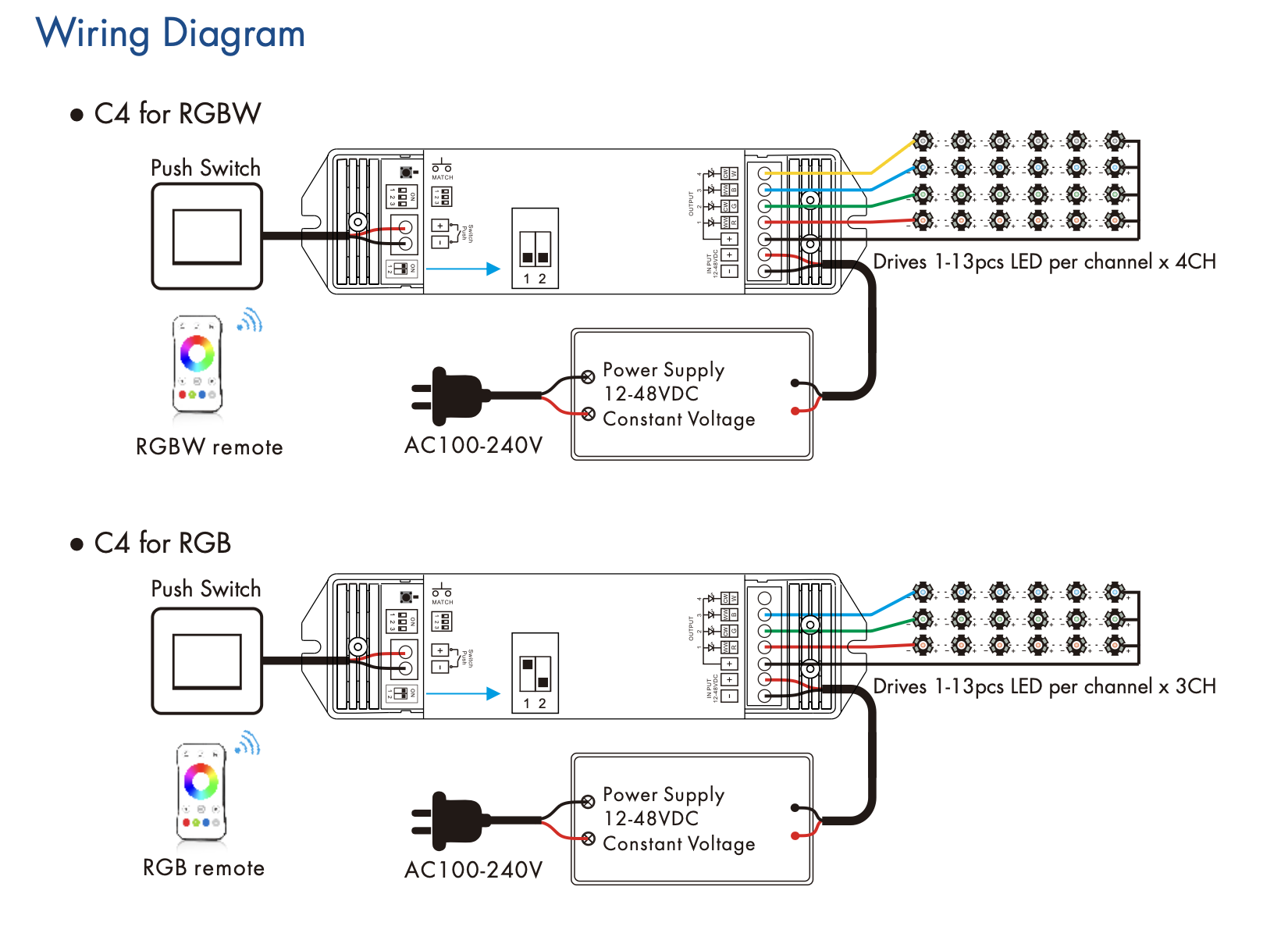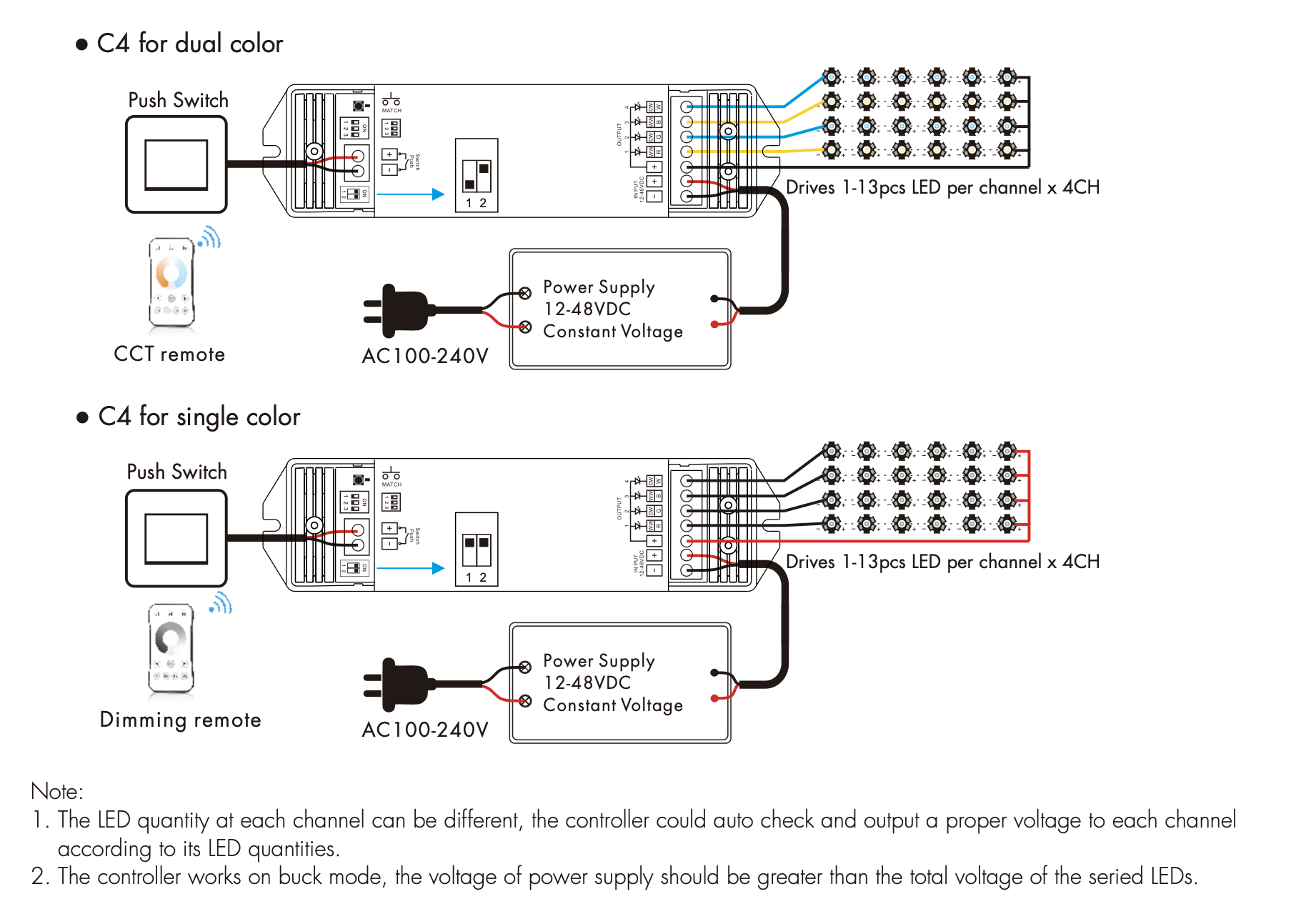 - Liczba diod LED w każdym kanale może być różna – sterownik automatycznie sprawdzi i dostosuje odpowiednie napięcie dla każdego kanału w zależności od ilości diod