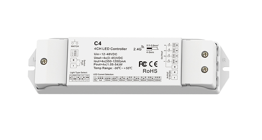 Czterokanałowy radiowy sterownik-ściemniacz LED C4(350-1200mA) z wyjściem prądowym 350-1200mA.
