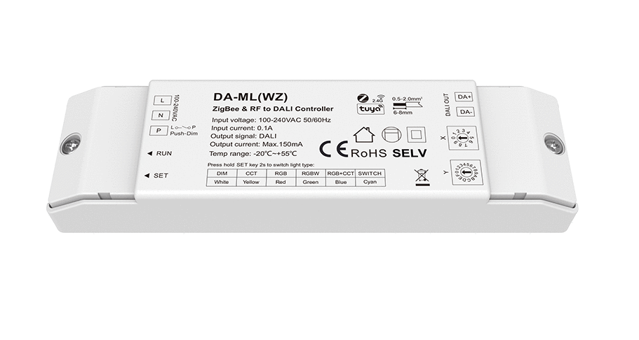 Sterownik DA-ML(WZ) to konwerter sygnału RF & ZigBee na szynę DALI bus. Zapełnia możliwość sterowania obciążeniem LED oraz taśmami mono/CCT/RGB/RGBW/RGB+CCT.