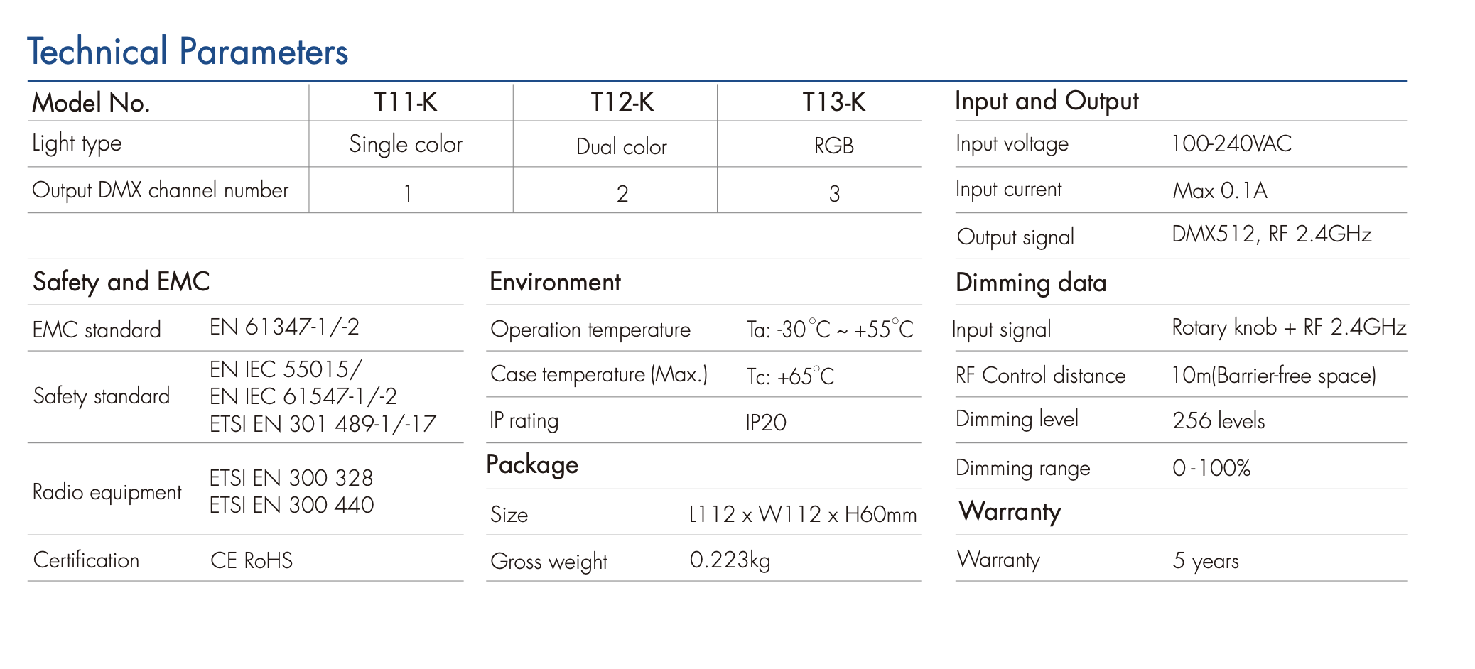 - Sygnał wyjściowy: DMX512, RF 2.4GHz