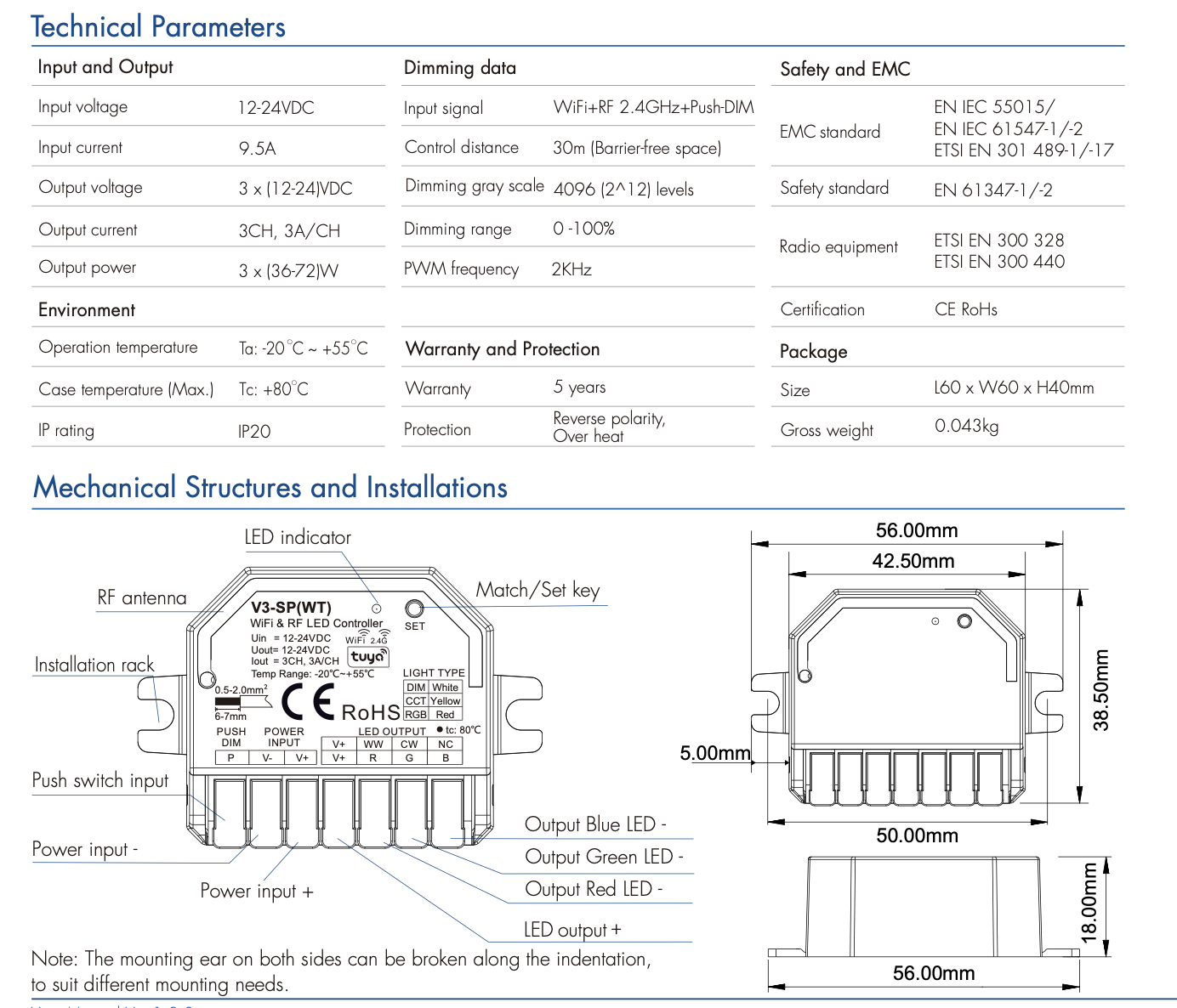 V3-SP(WT) Sterownik LED 3-w-1 RF & WiFi & Push-Dim Odbiornik SKYDANCE