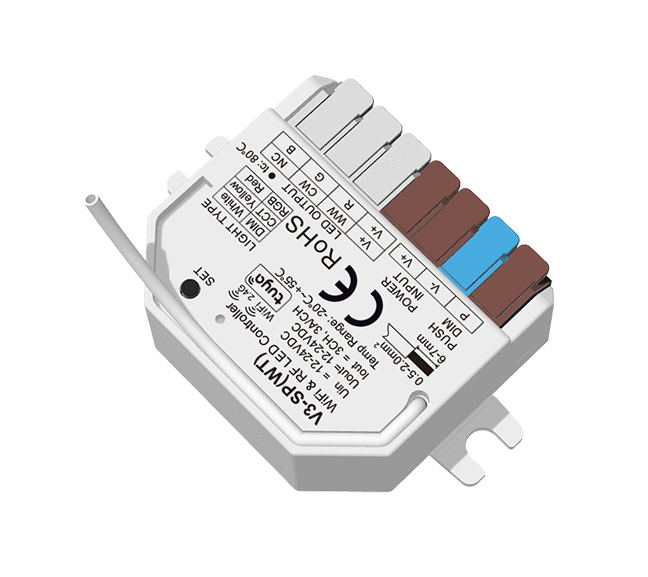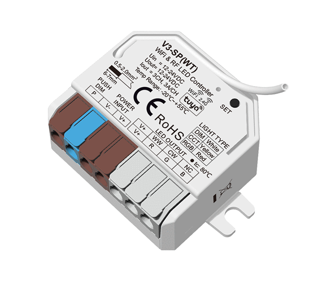 • Każdy kontroler V3-SP(WT) może działać także jako konwerter WiFi-RF, umożliwiając sterowanie jednym lub kilkoma kontrolerami LED RF lub sterownikami ściemniania LED RF w sposób synchroniczny przez aplikację Tuya Smart