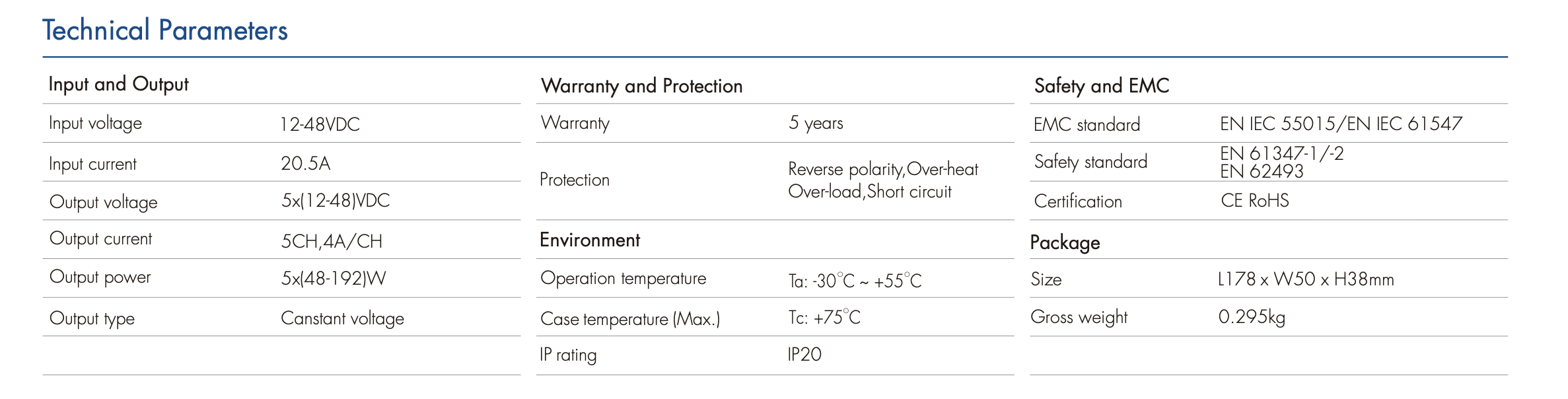 - Zabezpieczenie przed przegrzaniem / przeciążeniem / zwarciem, automatyczne odzyskiwanie po ustąpieniu usterki
