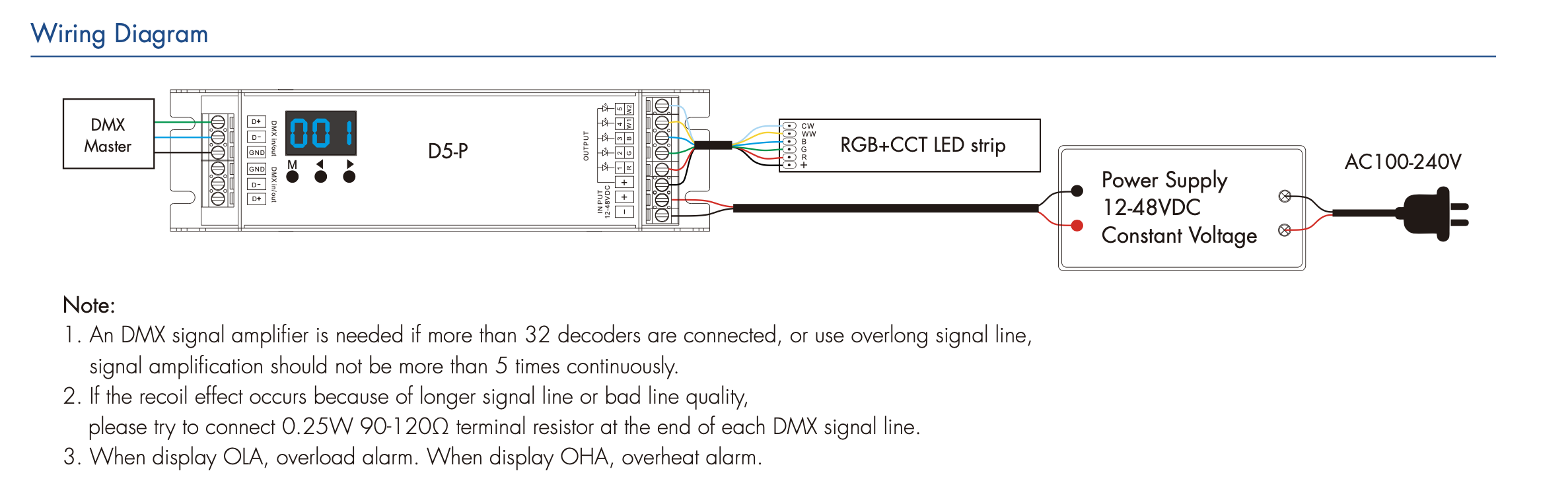 - D5-P posiada zielone złącza zaciskowe sygnału DMX