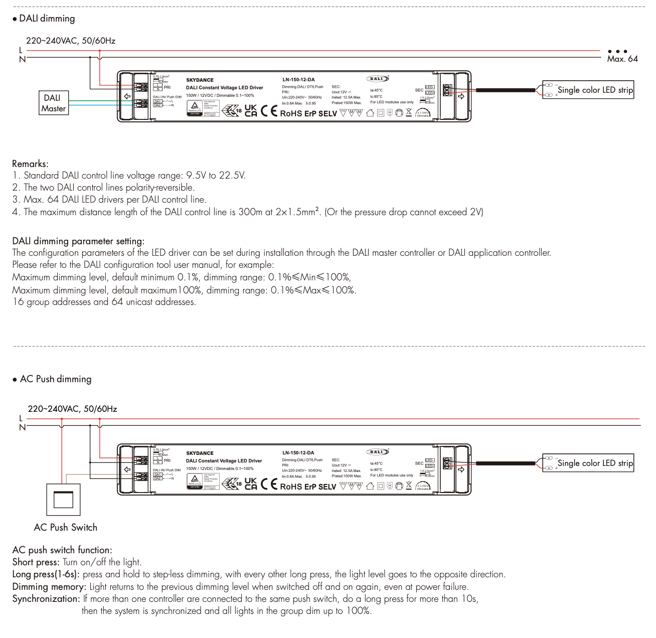 LN-150-12-DA Zasilacz LED DALI2 DT6 12V 150W PFC PushDimAC SKYDANCE