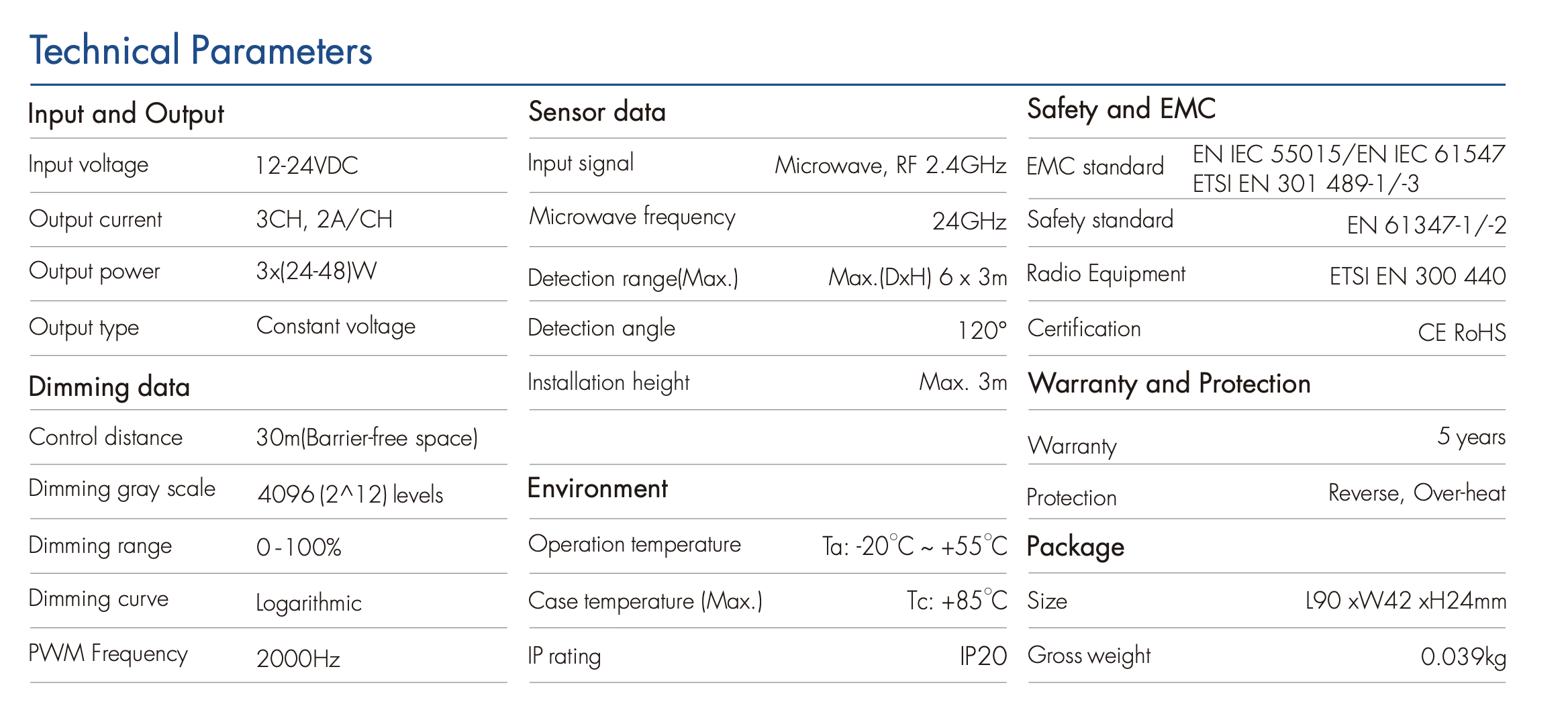 • Sterownik LED RF, 3-kanałowy, stałonapięciowy, ze wbudowanym modułem radaru obecności 24 GHz oraz czujnikiem światła dziennego