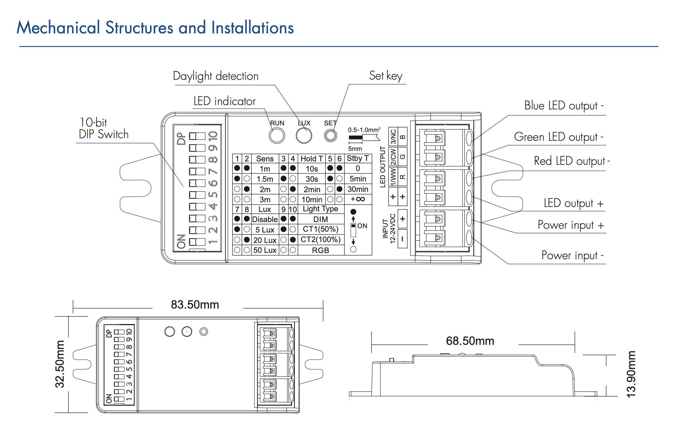 • Odległość detekcji, czas podtrzymania, czas czuwania, próg detekcji światła dziennego oraz typ światła – konfigurowane za pomocą 10-bitowego przełącznika DIP