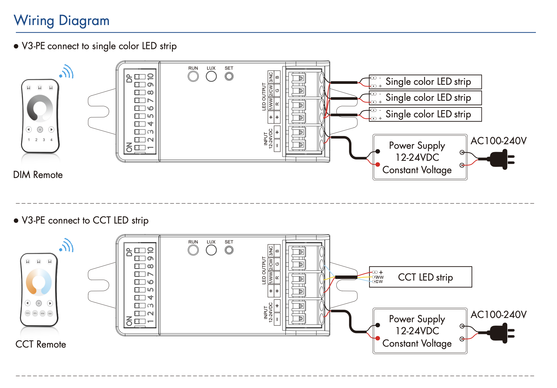 • Współpraca z pilotami RF 2.4G jedno- lub wielostrefowymi: DIM, CCT lub RGB