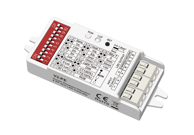 V3-PE to mikrofalowy czujnik obecności z sterownikiem RF  przyznaczony do sterowania taśmamiLED: