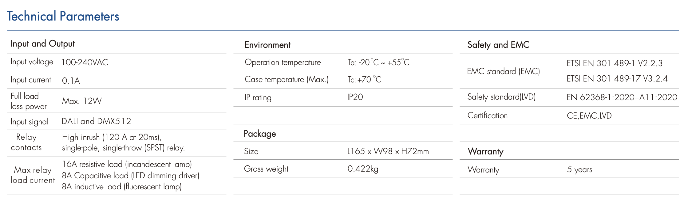 - Zgodność z urządzeniem DALI typu 7, certyfikacja DALI-2, zgodny ze standardem DALI IEC 62386-101, 102, 208 oraz kompatybilny z produktami DALI innych producentów