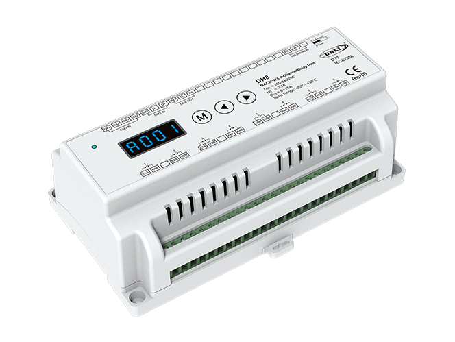 Przełącznik przekaźnikowy DALI z 8 adresami, 8 kanałami i wyjściem o maksymalnym natężeniu 16A na kanał, przystosowany do pracy z prądem przemiennym.