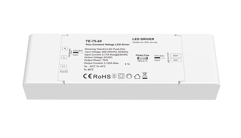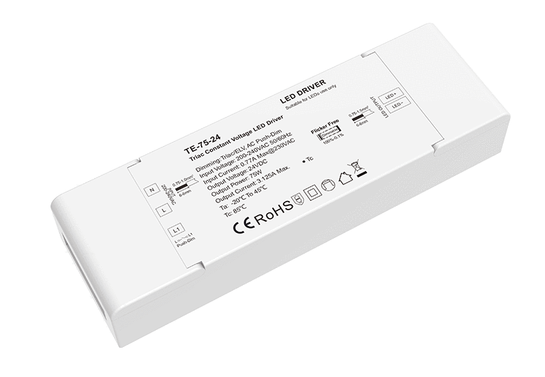 Ściemnialny zasilacz LED TE-75-24 służy do zasilania oraz zarządzania natężeniem światła emitowanego przez jednokolorową taśmę LED przy pomocy protokołu TRIAC.