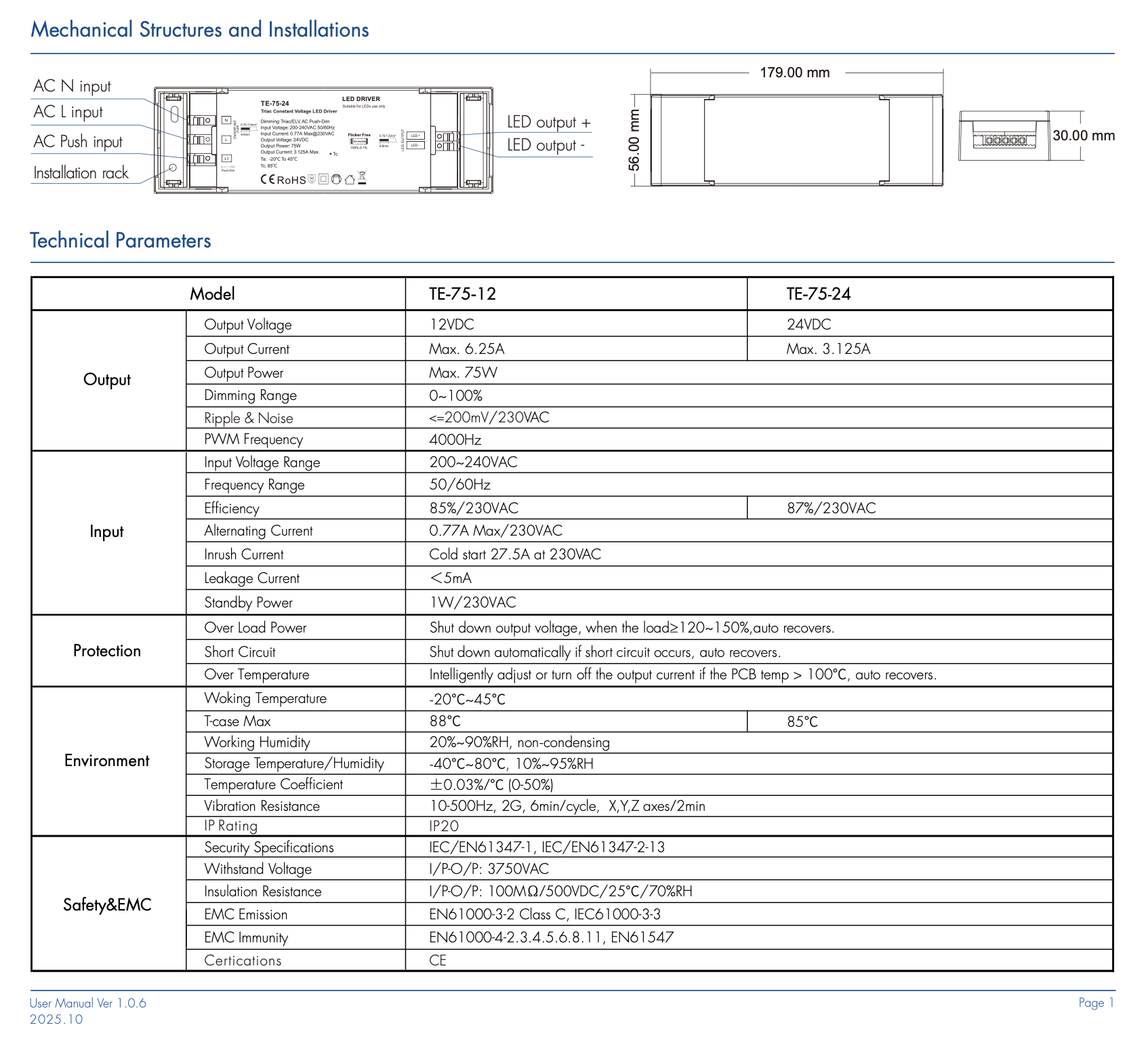 TE-75-24 Zasilacz meblowy LED IP20 24V 75W z wbudowanym ściemniaczem TRIAC & Push Dim AC230 SKYDANCE