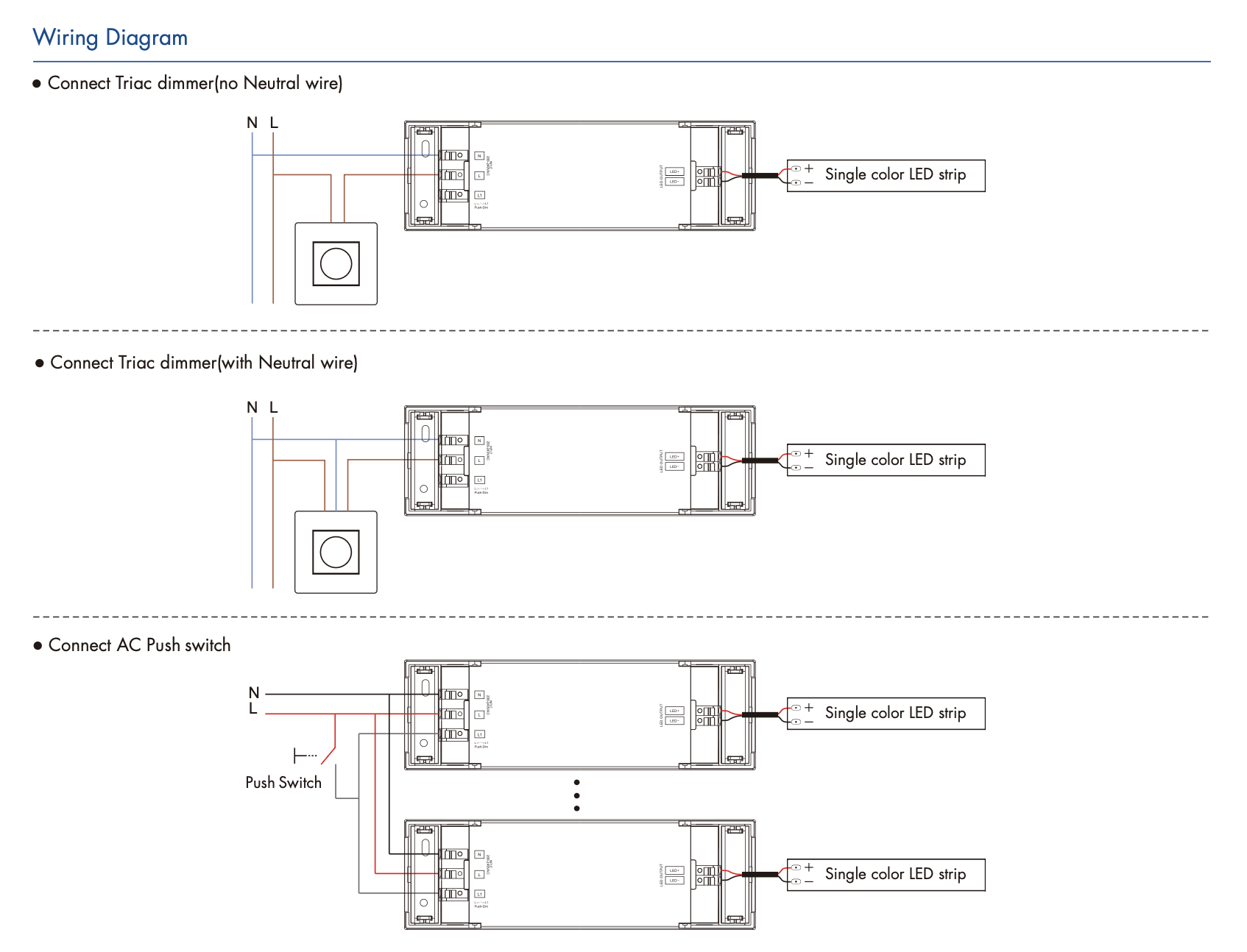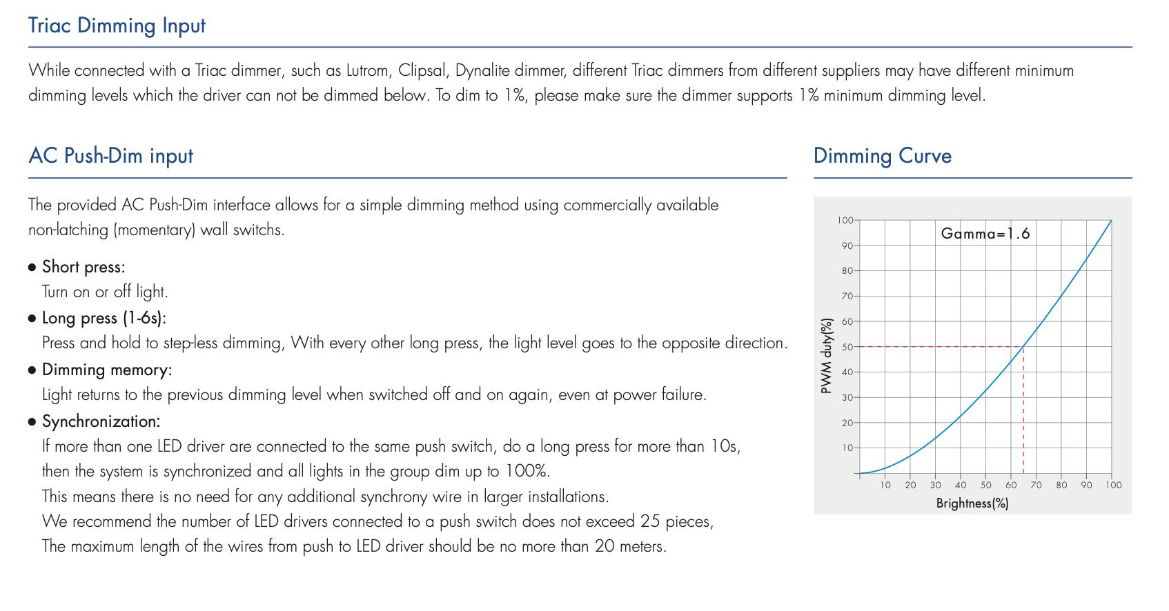 - Podczas współpracy ze ściemniaczem TRIAC (np. Lutron, Clipsal, Dynalite) różni producenci mogą stosować różne minimalne poziomy ściemniania, poniżej których zasilacz nie jest w stanie dalej redukować jasności.
