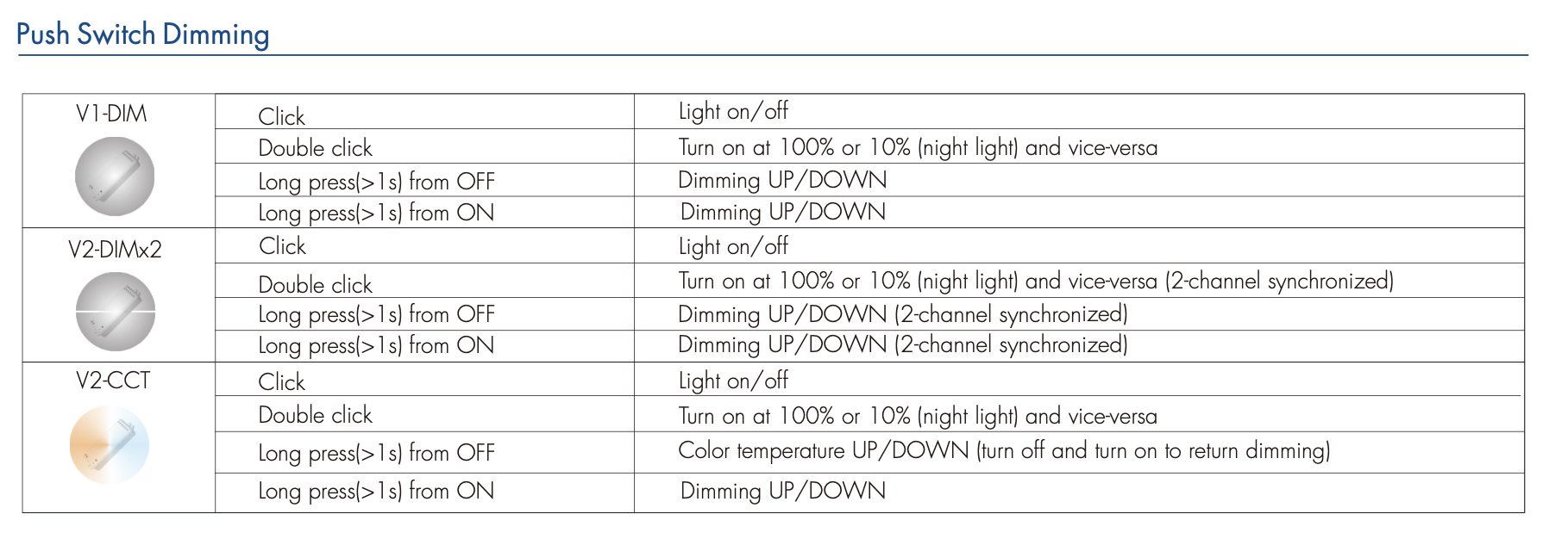 • Podłączenie przycisku monostabilnego (self-reset) umożliwia funkcje włącz/wyłącz oraz ściemnianie w zakresie 0–100%