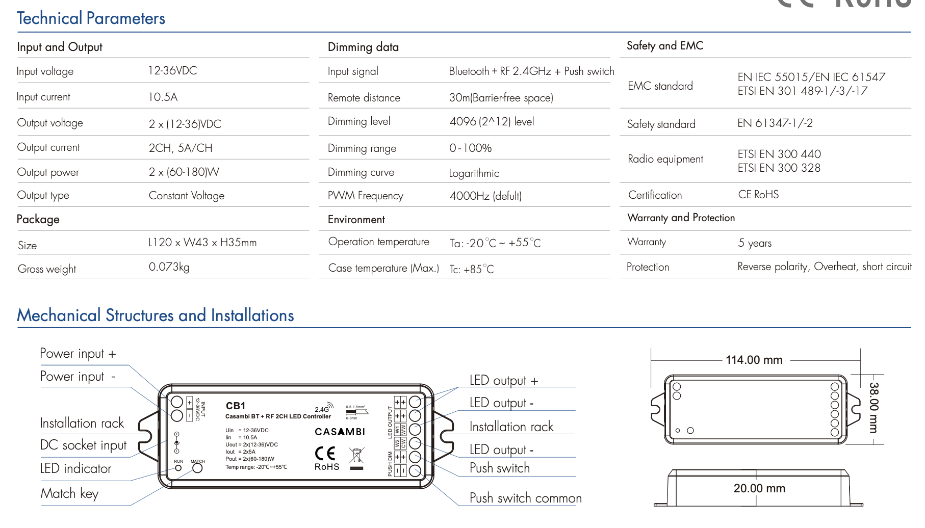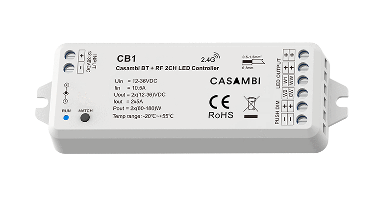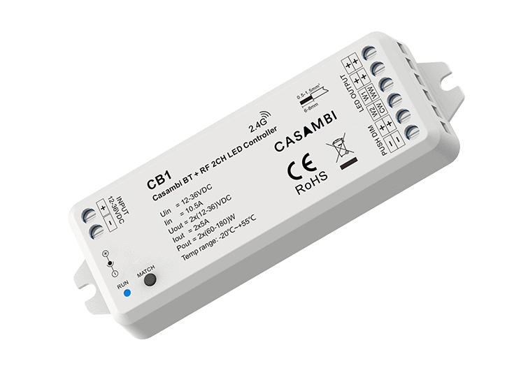 Odbiornik CB1 to 2-wyjściowy sterownik firmy Skydance przeznaczony do jedno- i dwukolorowych taśm LED za pomocą protokołu CASAMBI BT oraz RF 2.4 GHz.