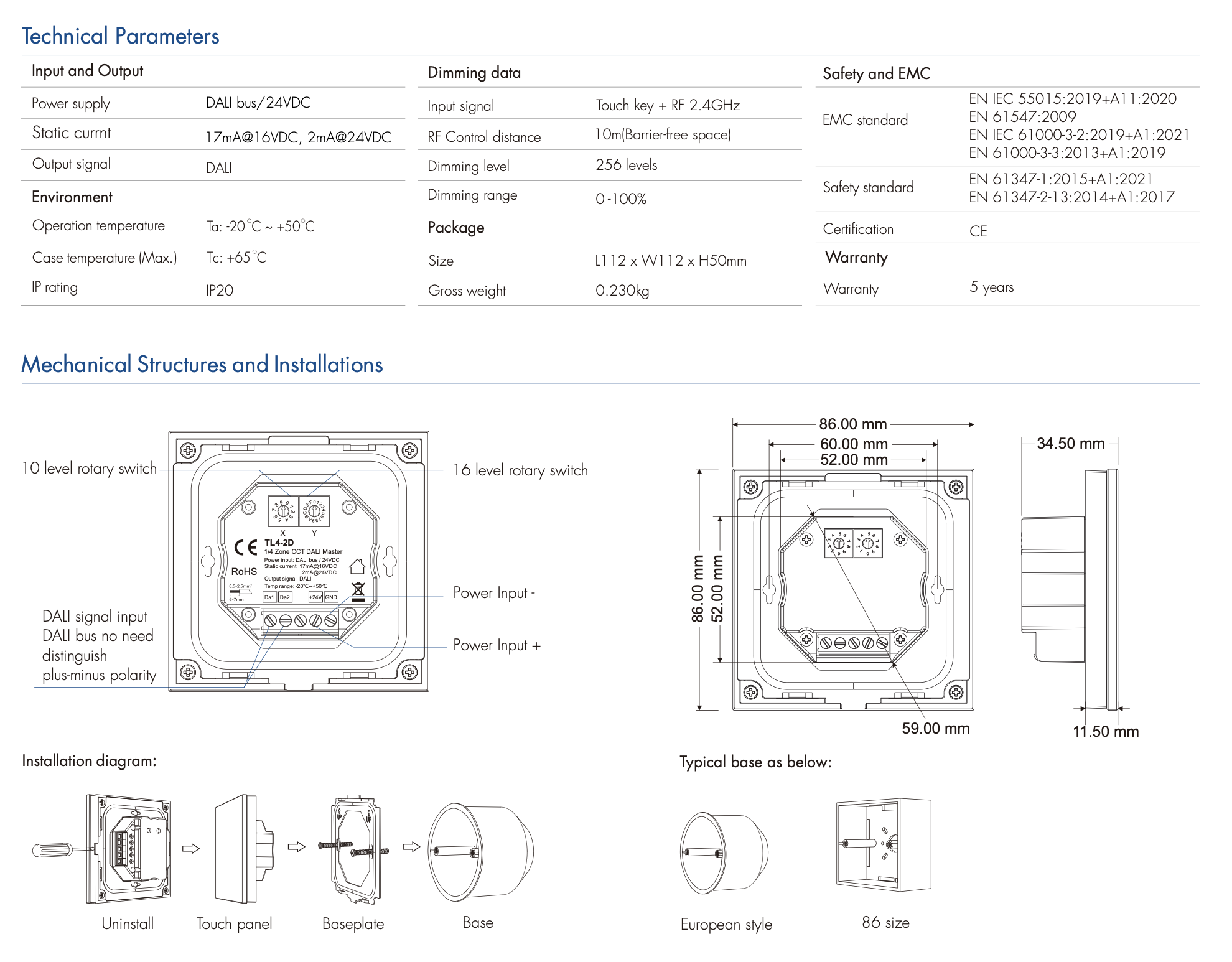 - Zgodność ze standardem: protokół DALI IEC 62386, kompatybilność z urządzeniami DALI innych międzynarodowych producentów