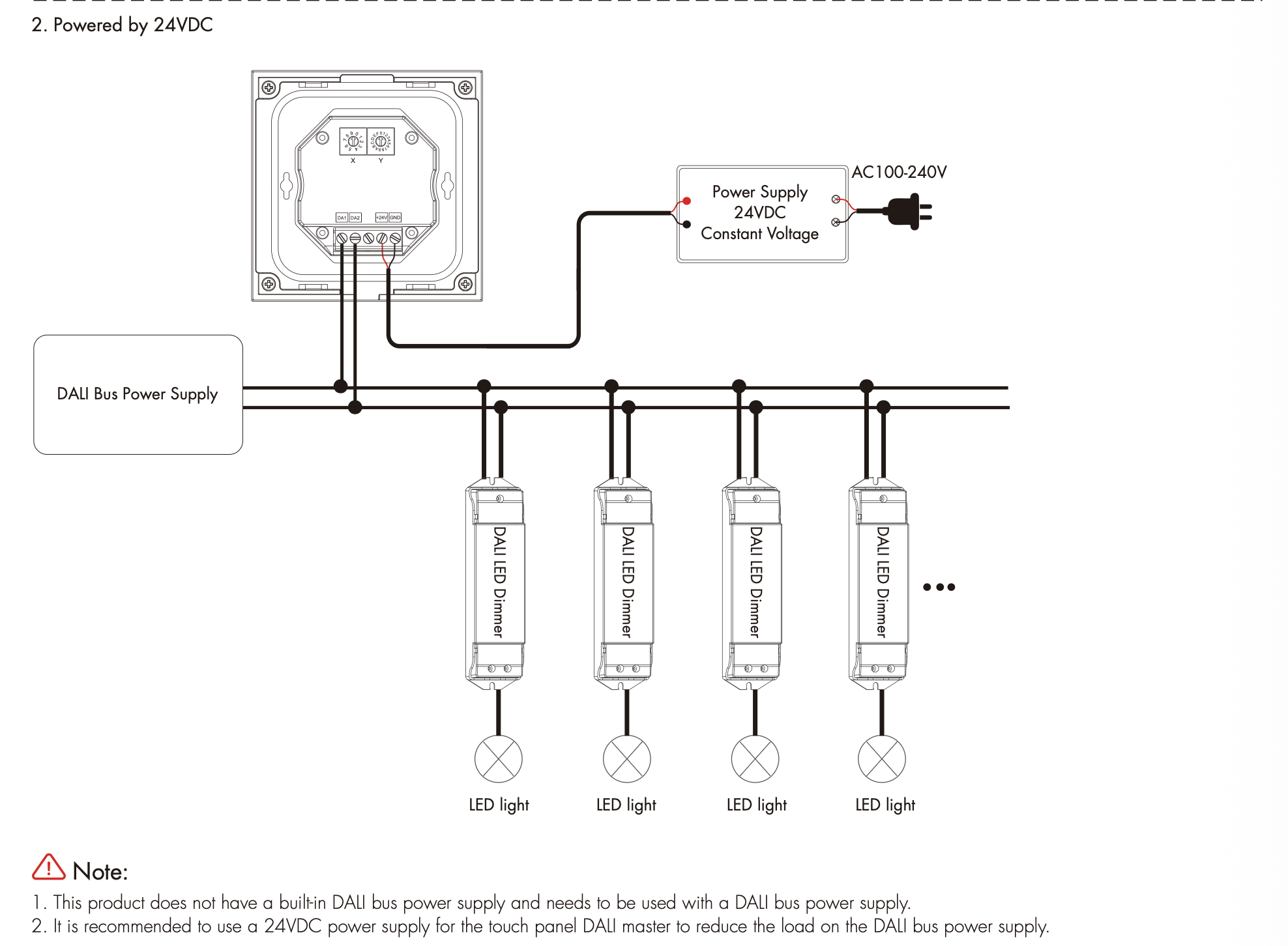 Zaleca się stosowanie zasilacza 24 V DC do zasilania panelu dotykowego DALI Master w celu zmniejszenia obciążenia zasilacza magistrali DALI.