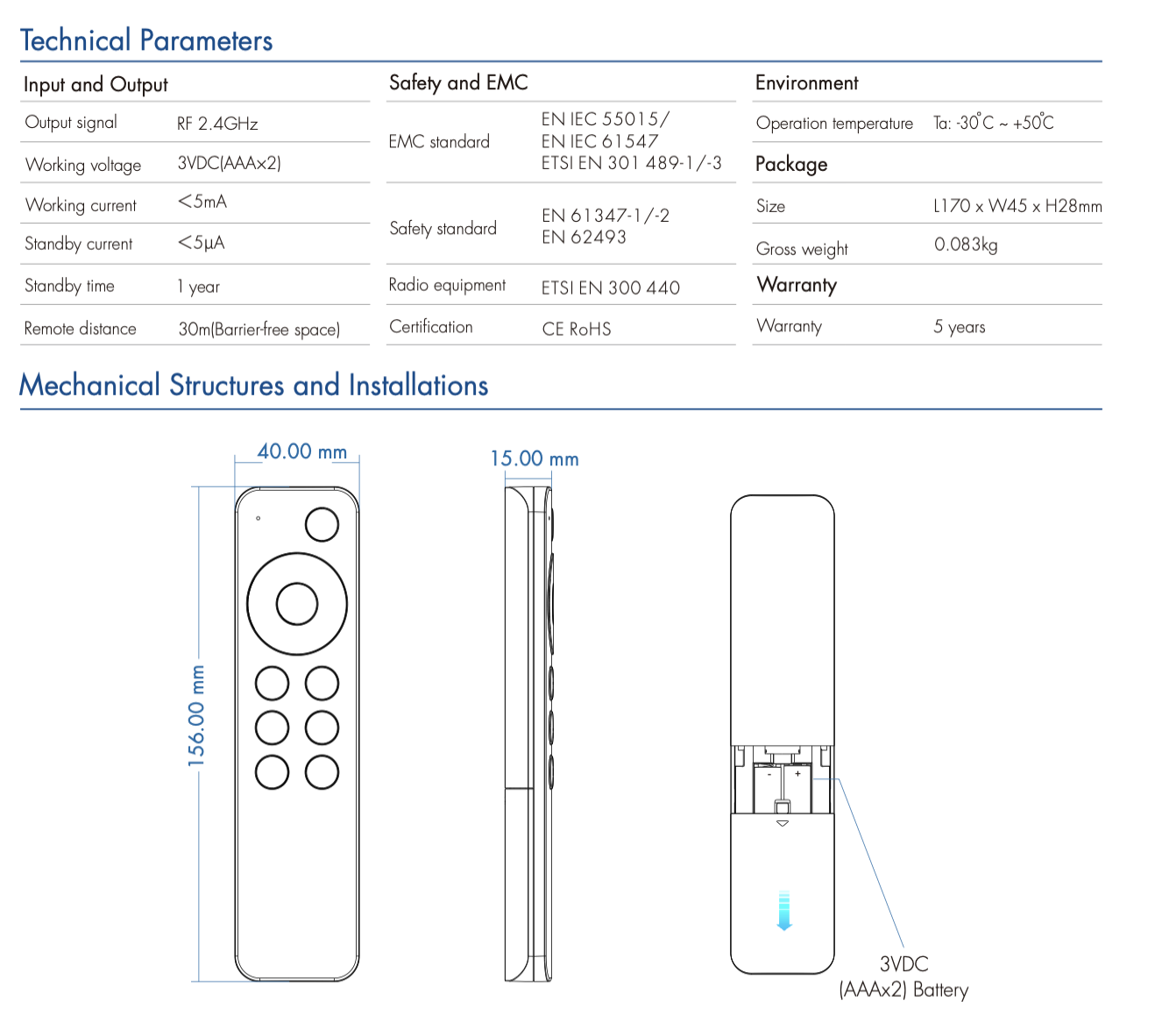 - Zasilanie: 3VDC (AAAx2) Battery
