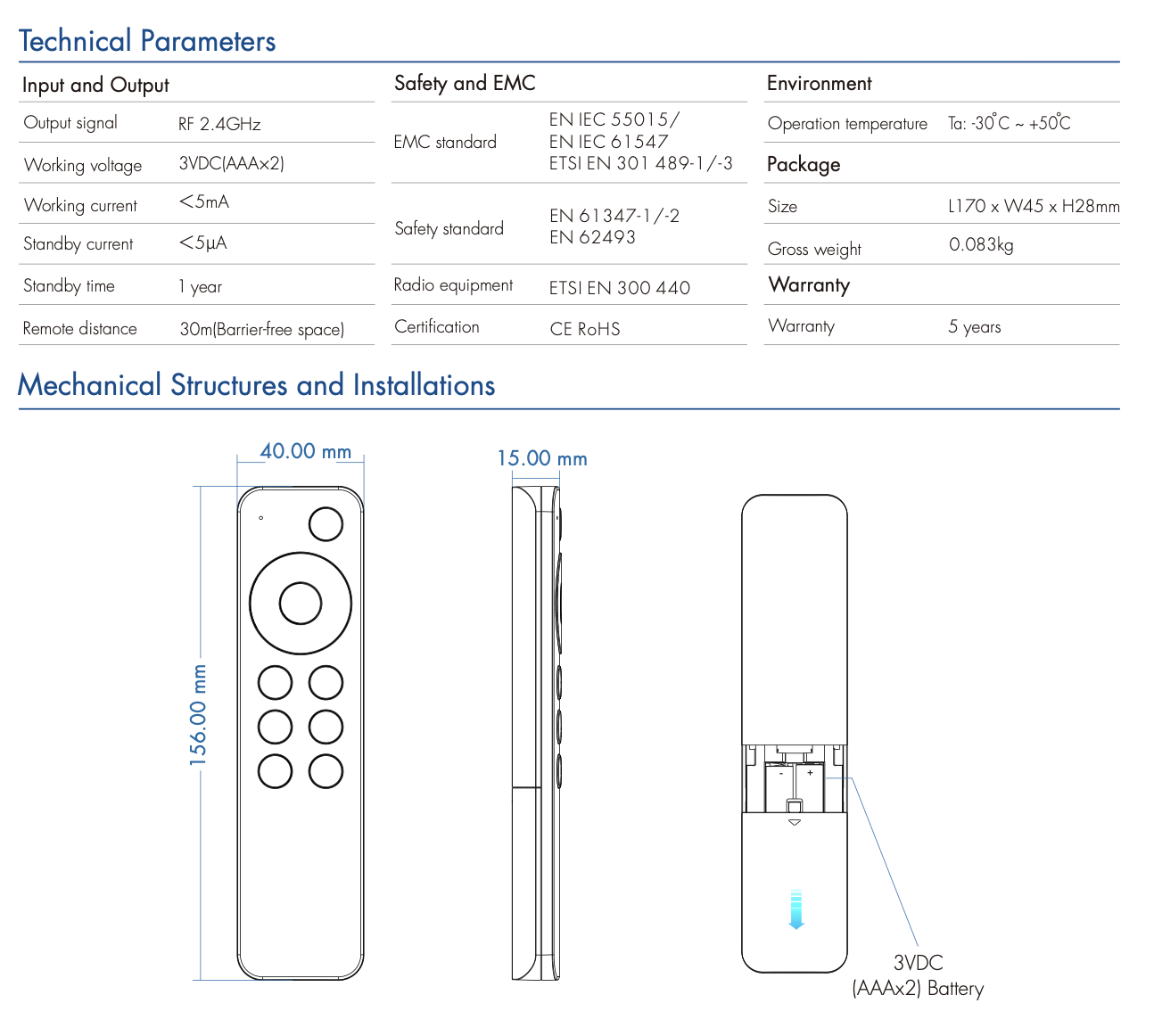 - Zasilanie: 3VDC (AAAx2) Battery