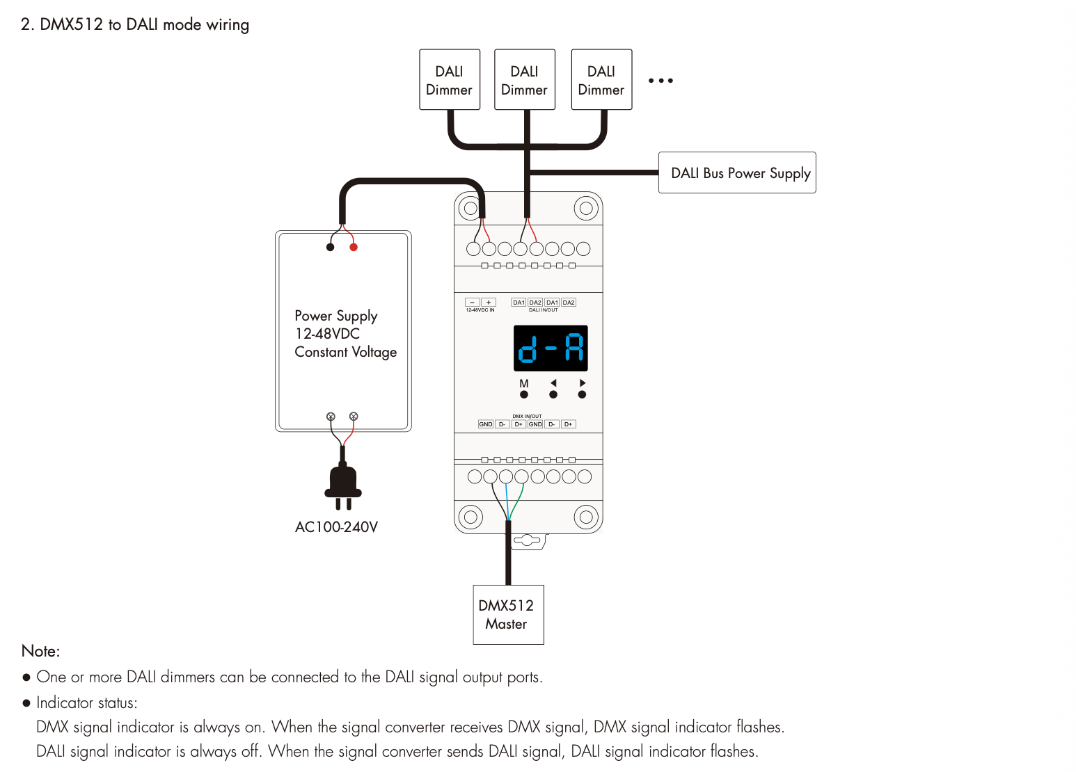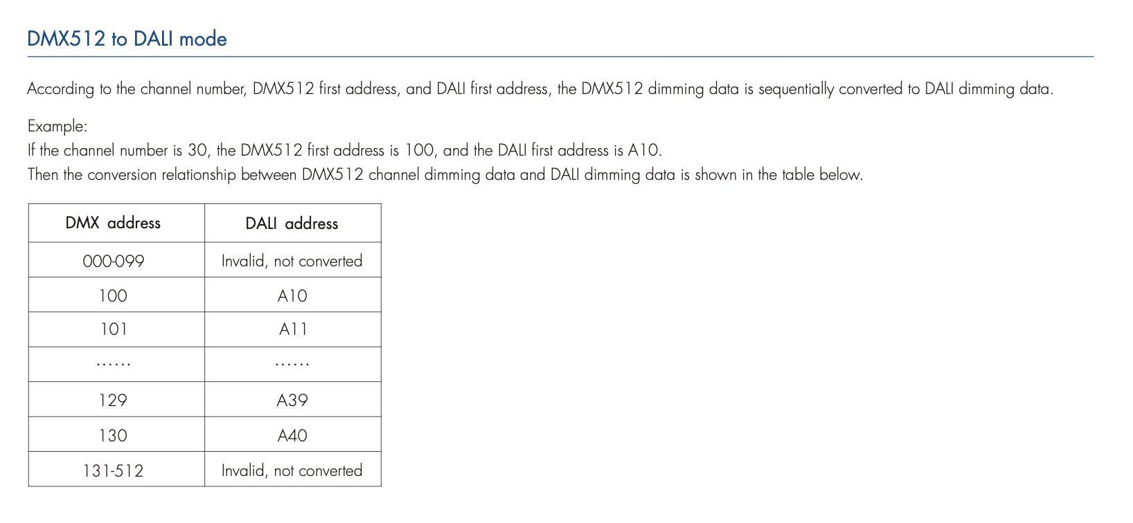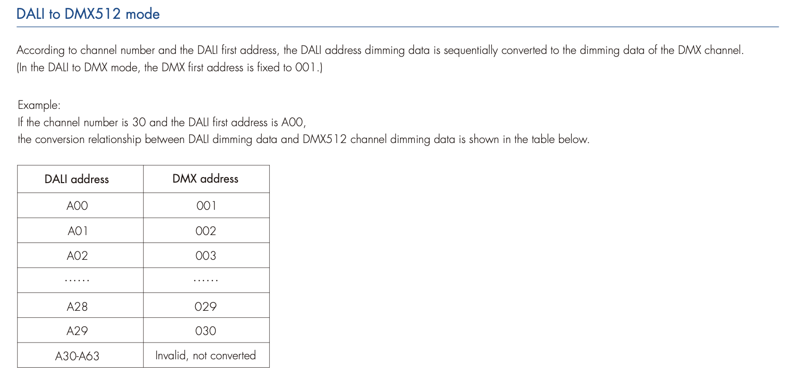- Konwerter sygnału DALI / DMX512, umożliwiający konwersję sygnału DALI na DMX512 w celu realizacji sterowania urządzeniami DMX przez master DALI, lub konwersję sygnału DMX512 na DALI w celu realizacji sterowania urządzeniami DALI przez master DMX