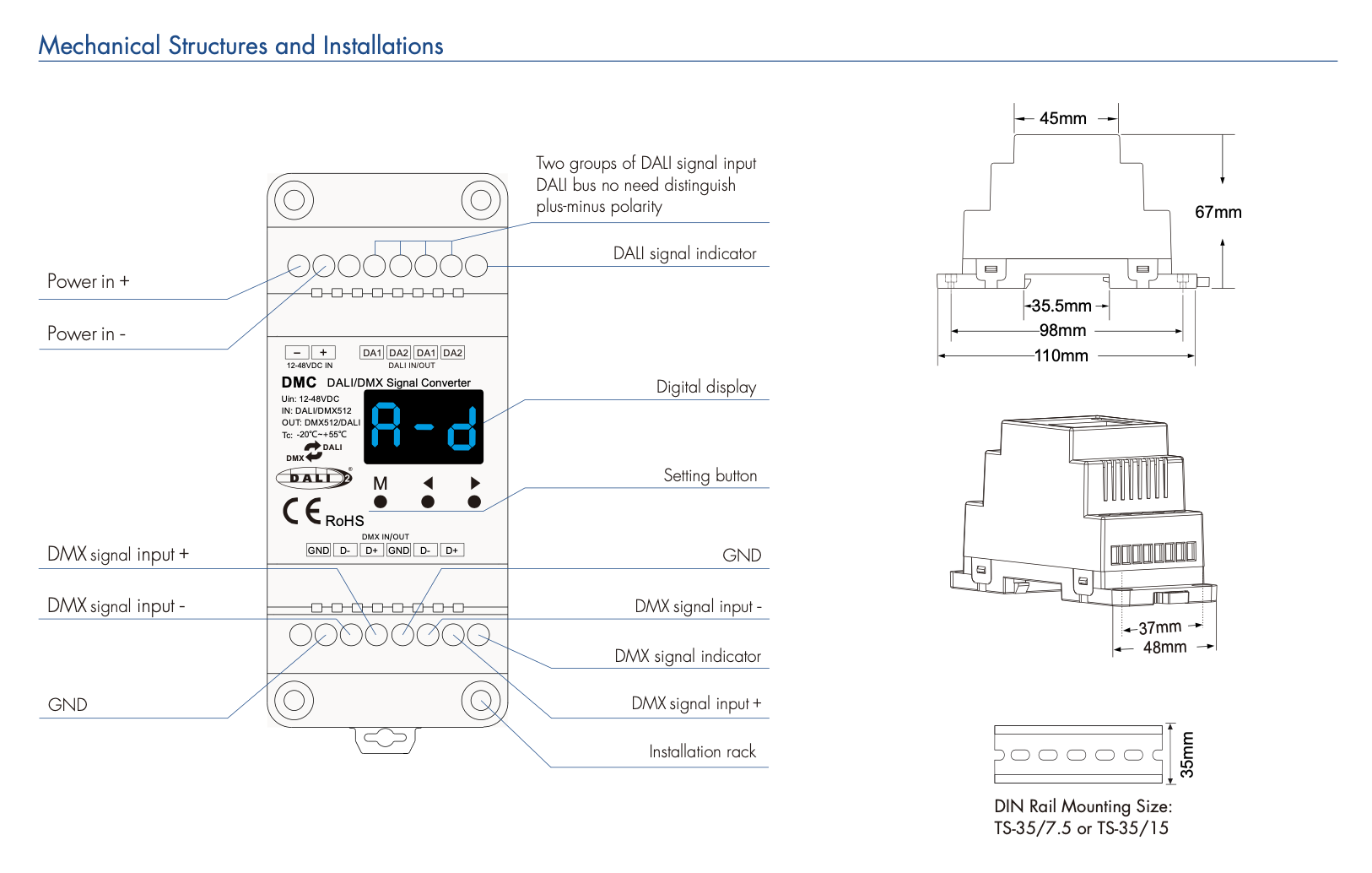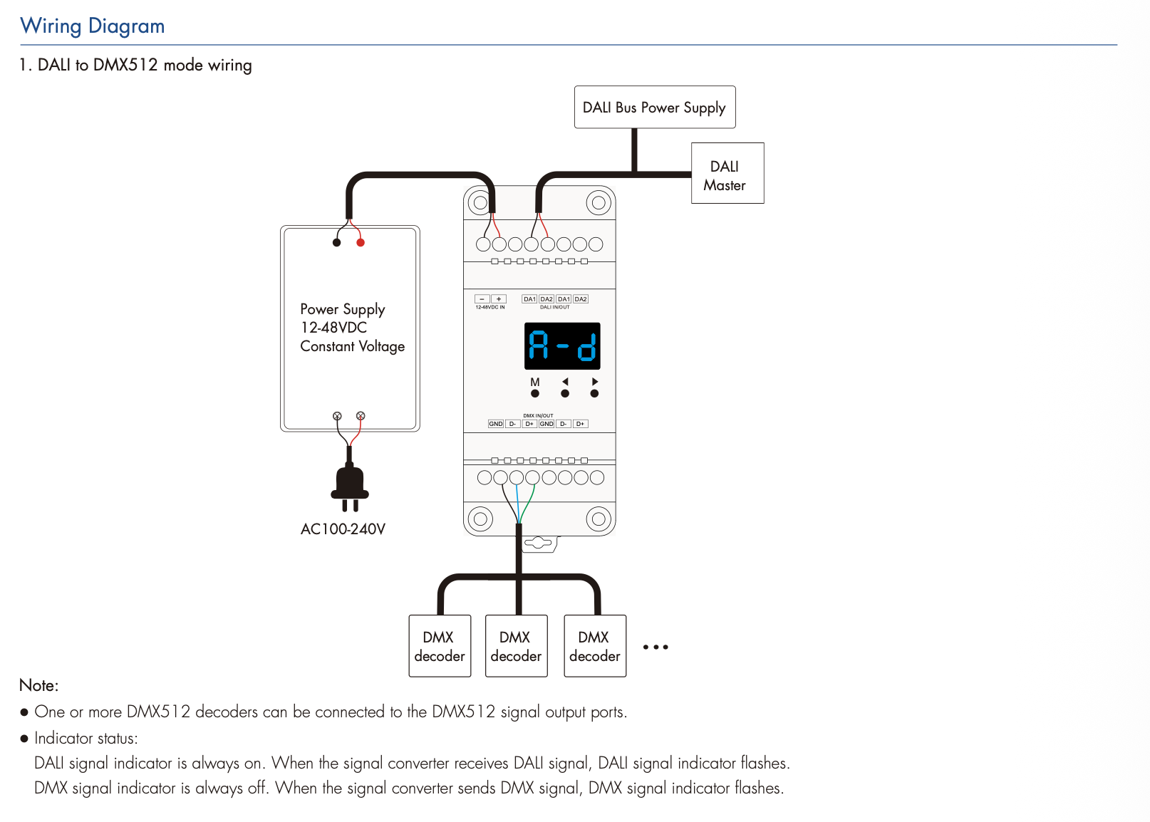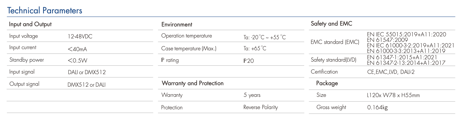 - Konwerter sygnału DALI / DMX512, umożliwiający konwersję sygnału DALI na DMX512 w celu realizacji sterowania urządzeniami DMX przez master DALI, lub konwersję sygnału DMX512 na DALI w celu realizacji sterowania urządzeniami DALI przez master DMX