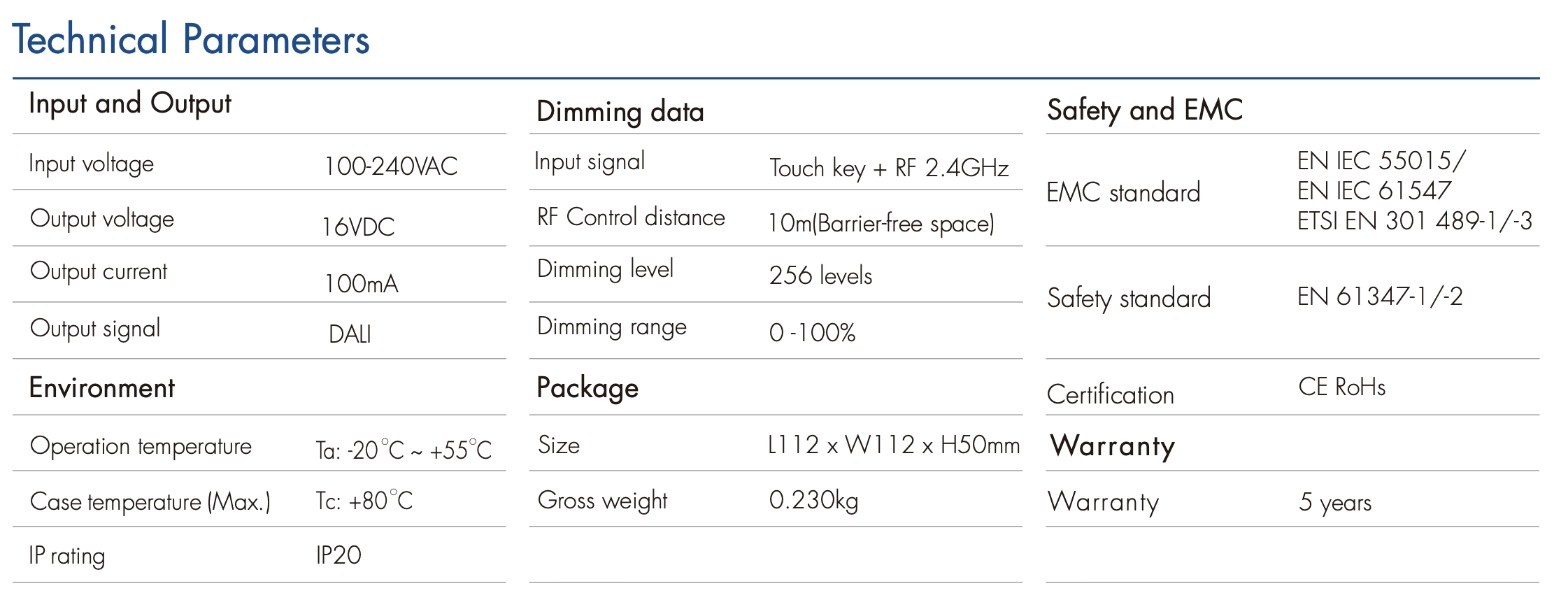 - Zgodność ze standardem: protokół DALI IEC 62386, kompatybilność z urządzeniami DALI innych producentów