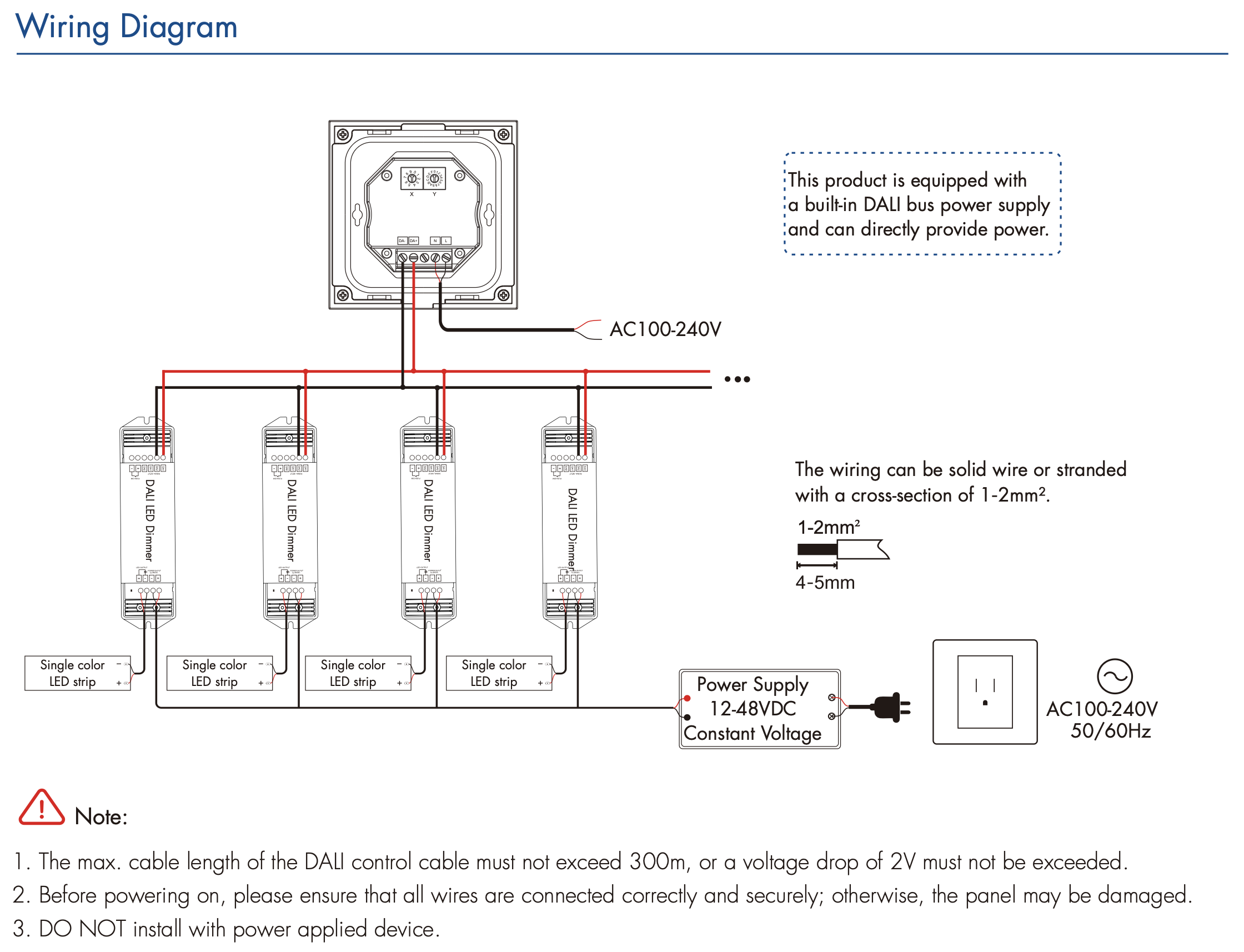Maksymalna długość przewodu sterującego DALI nie może przekraczać 300 m lub spadek napięcia nie może być większy niż 2 V.
