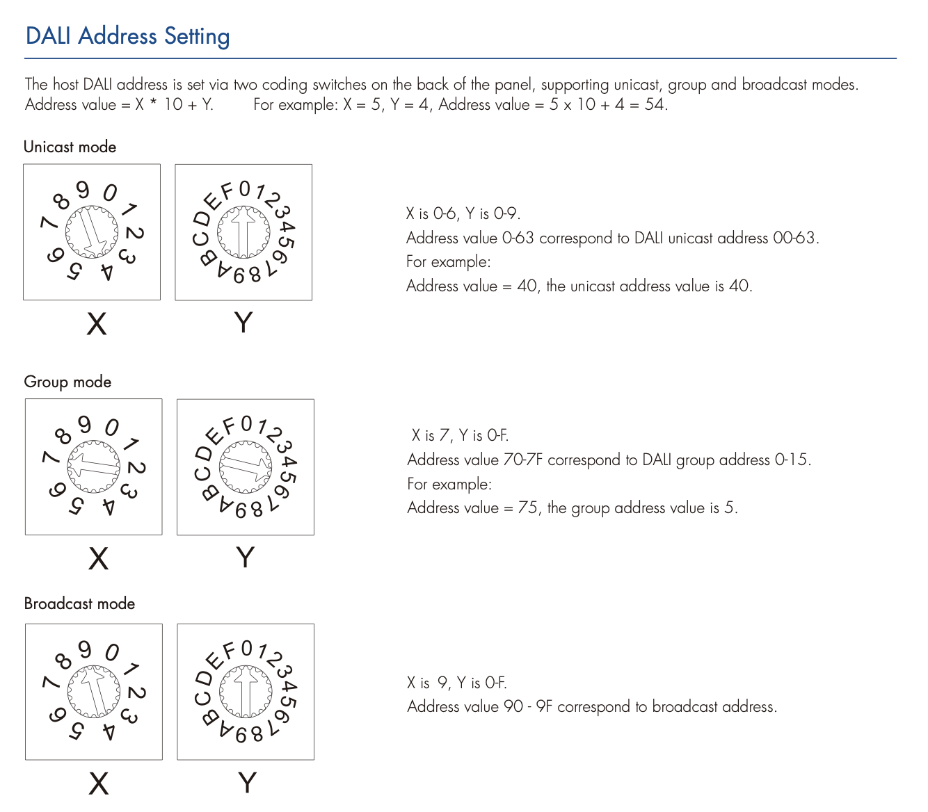 - Konfiguracja adresu DALI: ustawianie za pomocą przełącznika kodującego; obsługa trybów unicast, group oraz broadcast, a także przypisywanie adresów urządzeń podrzędnych (slave)